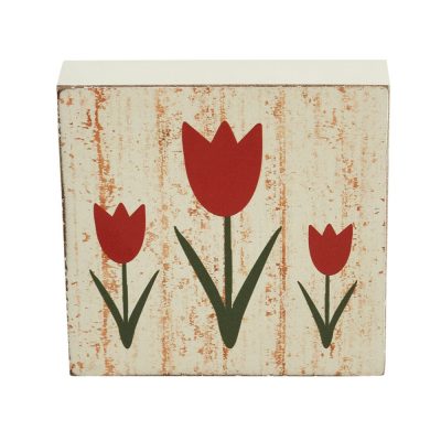 Spring In Bloom Red Tulips Distressed Antique White MDF Block Sign 5x5x1