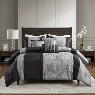 Madison Park Lori 6 Piece Jacquard Comforter Set with Throw Pillows in Black/Silver, Full/Queen MP10-8433