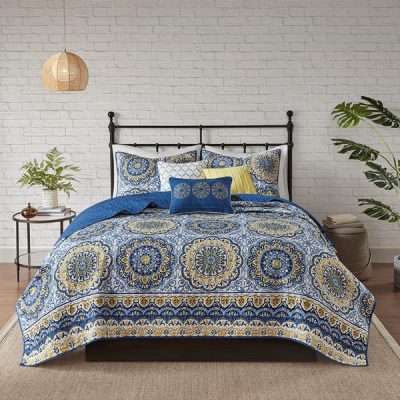 Madison Park Tangiers 6 Piece Reversible Quilt Set with Throw Pillows in Blue, Full/Queen MP13-783