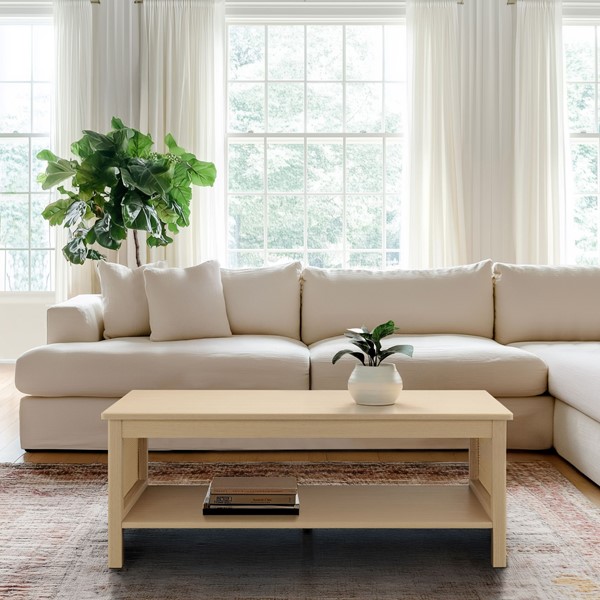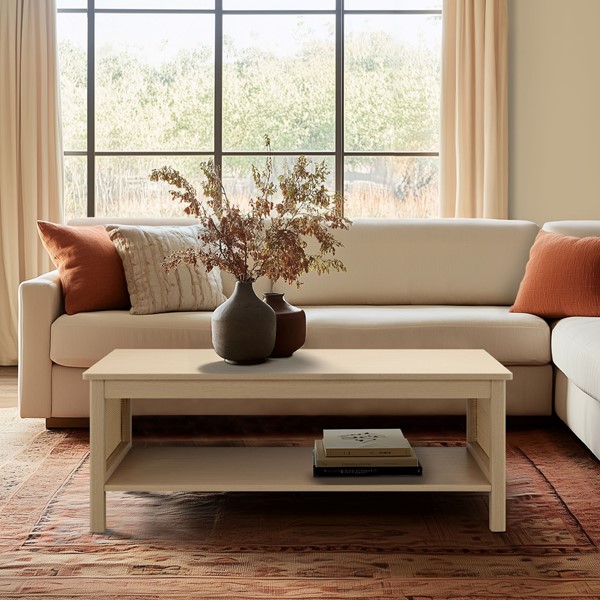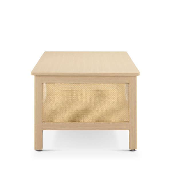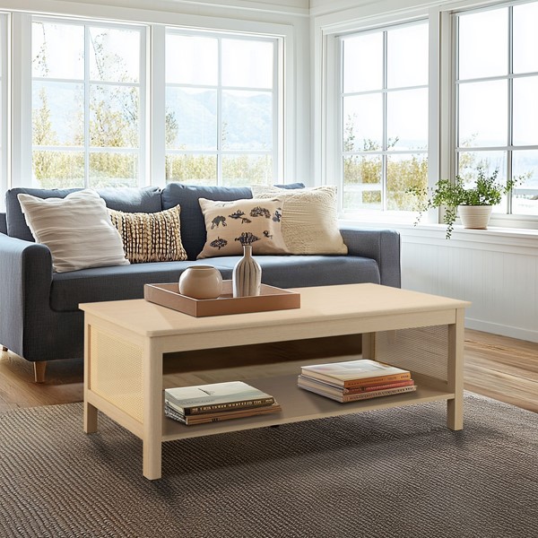 This 2-tier coffee table blends functionality with timeless charm. Crafted from engineered wood with a textured oak finish and synthetic rattan accents, it emulates natural woven rattan furniture while ensuring durability and easy maintenance. A spacious lower shelf provides ample storage for books, decor, or essentials, while a sturdy metal center support leg offers stability with a 75-lb tabletop capacity. Velcro glides protect floors, and ample base clearance makes it robot-vacuum friendly. Lightweight and easy to reposition, it’s perfect for modern living. Bring it home today!