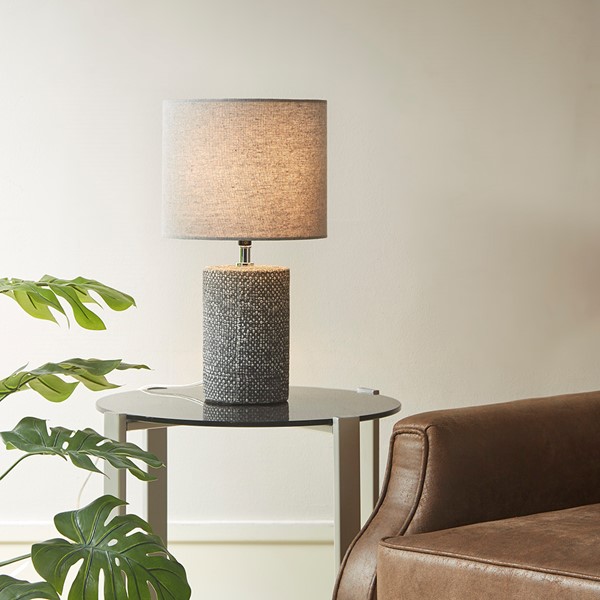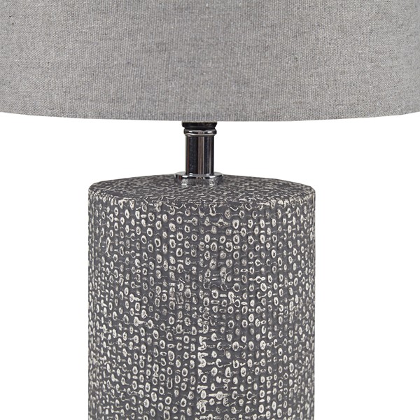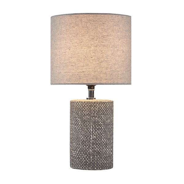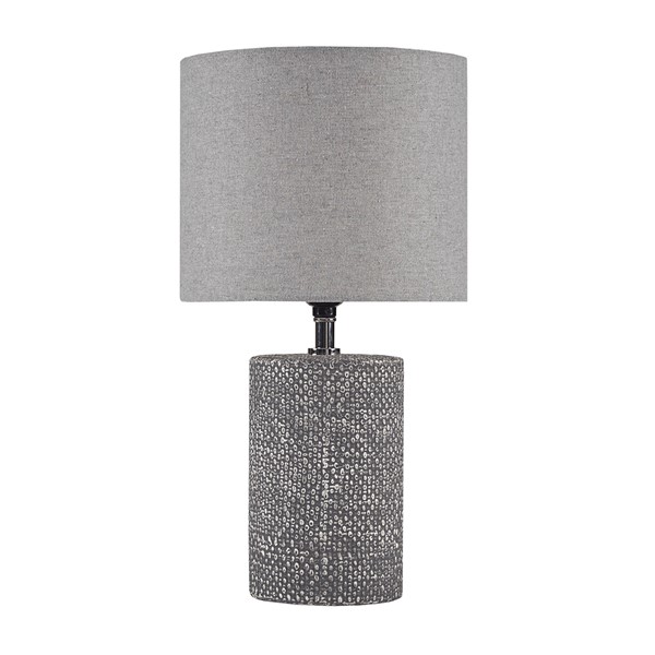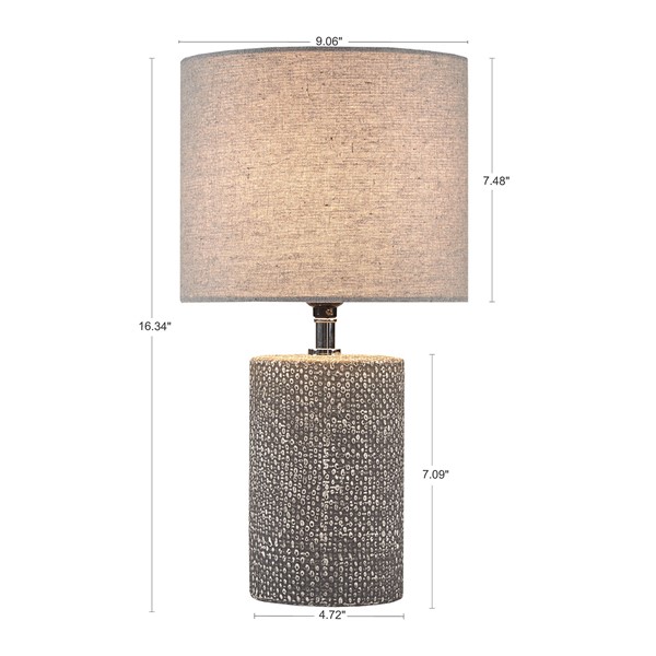 Complement your home decor with the bold modern style of 510 Design’s Bayard Embossed Ceramic Table Lamp. The cylinder-shaped, grey ceramic base flaunts a chic textured pattern that adds dimension to this table lamp, for a stunning contemporary design. The round, drum-shaped lamp shade provides a soft filter for the light to create a warm ambiance in your space. Illuminate your living room and give your home a stylish update with this ceramic table lamp. Handle with care. Spot clean only.