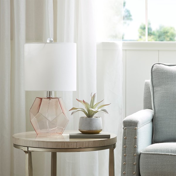 Elevate your home decor with the unique style of the 510 Design Bella Geometric Glass Table Lamp. This table lamp features a pink glass base with a white drum shade that creates a beautiful and eye-catching contrast. A 60-inch clear cord provides plenty of length to fit this glass table lamp in any room of your home. With simple and clean design, this glass table lamp elevates your space with style and elegance. Come with a 2 year limited warranty. 1 Type-A light bulb is needed and NOT included. Spot clean only.
