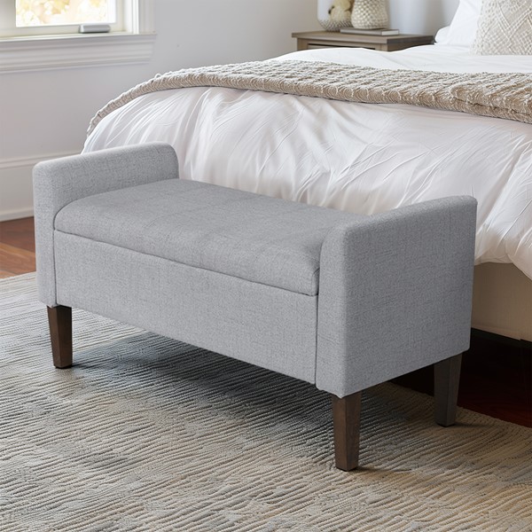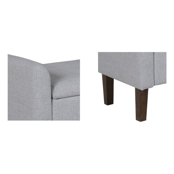 Elevate your space with our transitional storage ottoman bench. The clean lines, curved arms, and ample storage space make it perfect for modern and contemporary entryways, bedrooms, and guest rooms. The solid wood and plywood frame and legs, polyester-blend upholstery, and foam-filled seat cushion make it sturdy and durable. The storage space beneath the cushion and safe flip-top hardware add convenience. Plus, tool-less assembly makes it easy to set up.