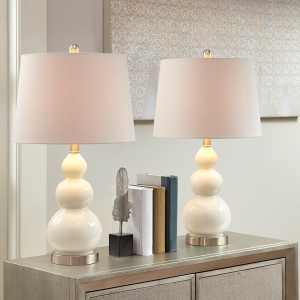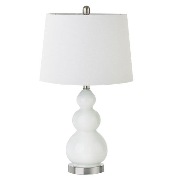 Enhance your space with the Covey Curved Glass Table Lamp, Set of 2. The beautiful white glass and silver metal base is complemented by white tapered drum shape shade that adds the right touch to the design. Place this table lamp in your living room or bedroom to complete your home decor. One Type A bulb is needed.