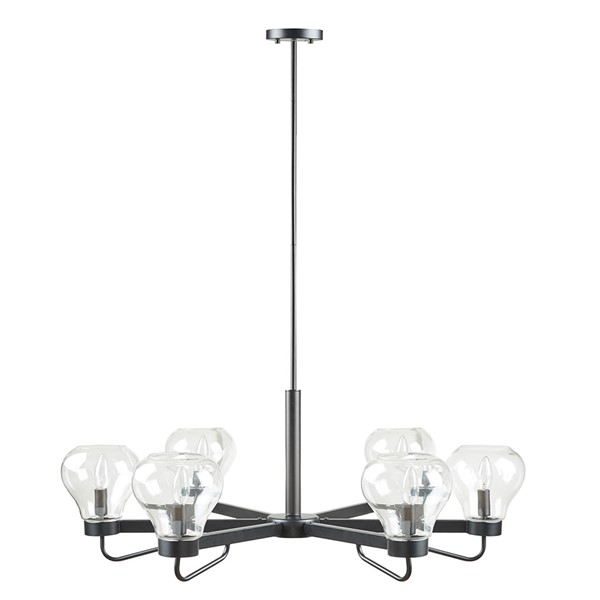 The 510 Design Devon 6-Light Chandelier with Bowl Shaped Glass Shades combines classic and modern styles to elevate your decor. This chandelier features 6 uplights with distinctive clear bowl-shaped shades to create a unique modern look. The black metal finish on frame adds that classic touch to complete the design. Also included are 4 piece extension rods, 1 that measures 9.75″, 2 that measure 12″ and 1 that measures 6″, which allow you to adjust the height between 14.75″ and 54.5″. Hardwired for indoor use only, this mid-century style chandelier is not compatible with a sloped ceiling and professional installation is recommended. Mounting hardware is included. Uses 6 Type B 40 Watt light bulbs (not included).