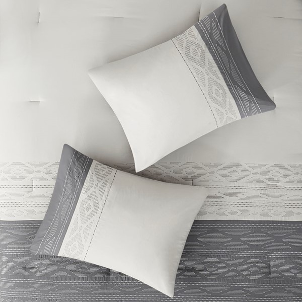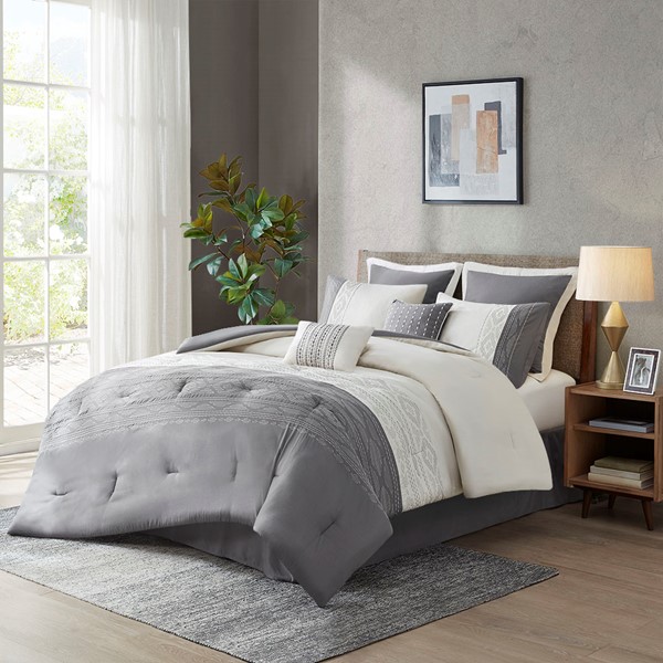 * Transitional 8 piece comforter set in two main tones (grey and oatmeal) with embroidered and pieced details
