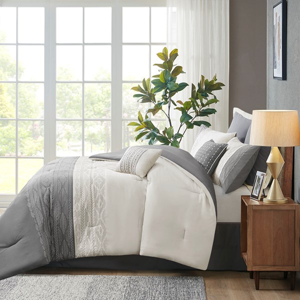 The 510 Design Helena 8 Piece Embroidered Comforter Set offers a simple elegance to refresh your bedroom decor. The two-tone comforter features embroidered and pieced details on a grey and oatmeal tone fabric, for a sophisticated and graceful design. A solid grey reverse complements the top of the two-tone comforter to give you a chic look that combines transitional style with modern colors. The 2 matching shams and 2 Euro shams pair handsomely with the comforter to complete the embroidered comforter set. Also included are 2 decorative pillows with embroidered details that provide the finishing touches. Machine washable for easy care, this soft comforter set may come in rolled or compressed packing and will need to be fluffed up. Use a steam iron to help remove wrinkles easier.