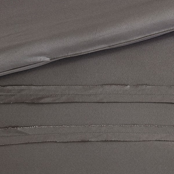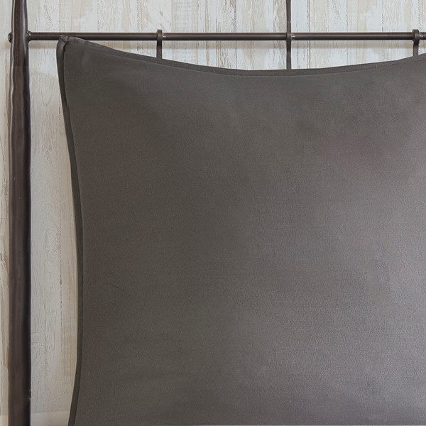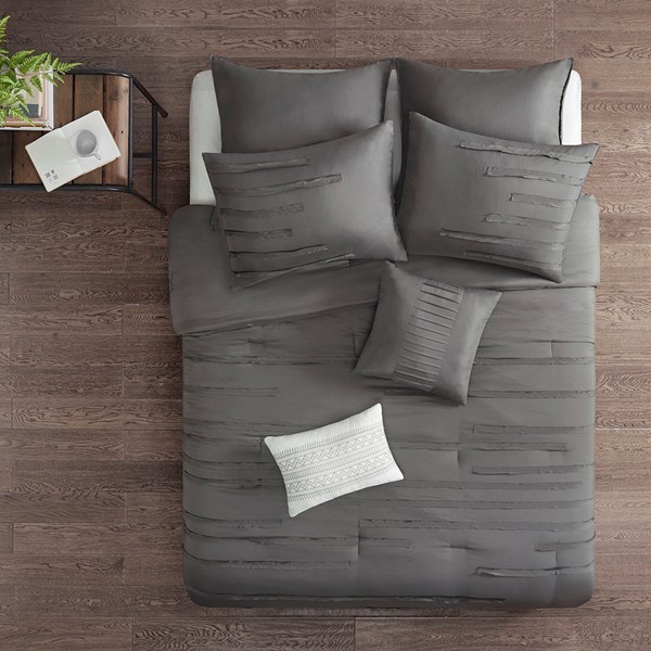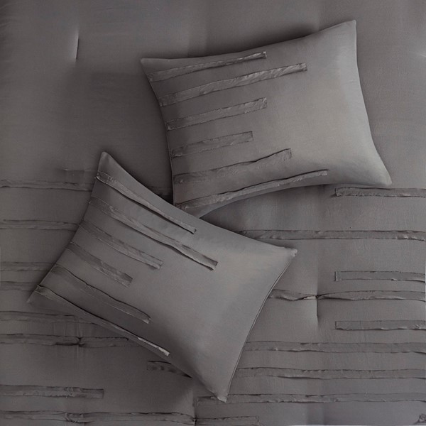 Bring a casual farmhouse look to your bedroom decor with the 510 Design Jenda 8 Piece Comforter Set. The dark grey comforter and shams feature raw edge ribbon detailing that add dimension and texture to the top of the bed. Matching solid grey Euro shams complement the casual bedding set, while decorative pillows with embroidery and pleated details provide elegant accents. A solid grey bed skirt completes the bedding set to give it a clean finish. Made from ultra-soft microfiber with hypoallergenic filling, this farmhouse comforter set is machine washable for easy care. The microfiber bedding set may come in rolled or compressed packing and will need to be fluffed up. Use a steam iron to help remove wrinkles easier.