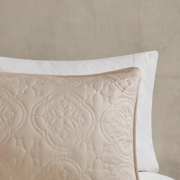 This 3 Piece reversible bedspread set offers a simple and stylish addition to your bedroom decor. A quilted medallion technique is displayed on the khaki bedspread and shams, adding dimension and charm to the top of the bed. Unlike traditional coverlets or quilts, this bedspread is oversized to drape better and features 100% hypoallergenic polyester filling. Made from ultra-soft microfiber, this oversized cover up is machine washable for easy care and adds a chic transitional allure to your bedroom.
