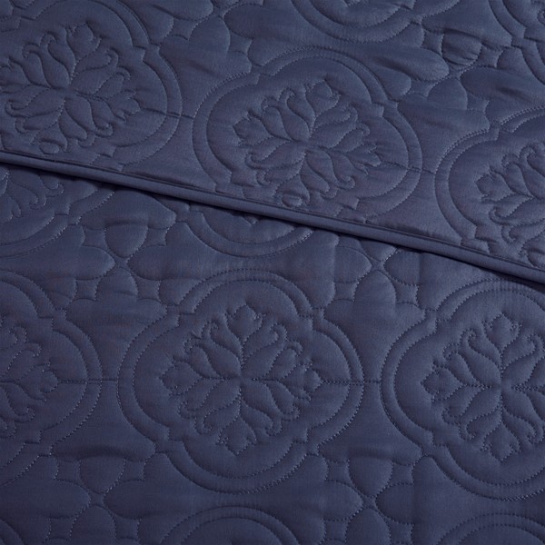 This 3 Piece reversible bedspread set offers a simple and stylish addition to your bedroom decor. A quilted medallion technique is displayed on the navy bedspread and shams, adding dimension and charm to the top of the bed. Unlike traditional coverlets or quilts, this bedspread is oversized to drape better and features 100% hypoallergenic polyester filling. Made from ultra-soft microfiber, this oversized cover up is machine washable for easy care and adds a chic transitional allure to your bedroom.