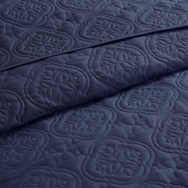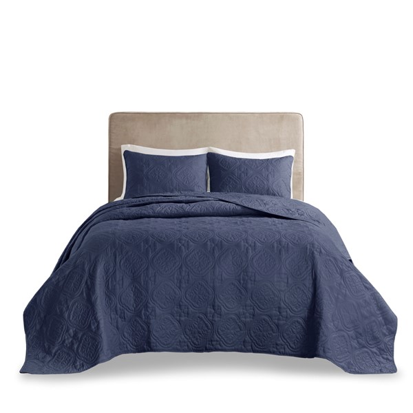 This 3 Piece reversible bedspread set offers a simple and stylish addition to your bedroom decor. A quilted medallion technique is displayed on the navy bedspread and shams, adding dimension and charm to the top of the bed. Unlike traditional coverlets or quilts, this bedspread is oversized to drape better and features 100% hypoallergenic polyester filling. Made from ultra-soft microfiber, this oversized cover up is machine washable for easy care and adds a chic transitional allure to your bedroom.