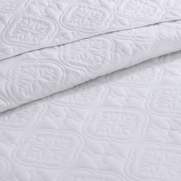This 3 Piece reversible bedspread set offers a simple and stylish addition to your bedroom decor. A quilted medallion technique is displayed on the white bedspread and shams, adding dimension and charm to the top of the bed. Unlike traditional coverlets or quilts, this bedspread is oversized to drape better and features 100% hypoallergenic polyester filling. Made from ultra-soft microfiber, this oversized cover up is machine washable for easy care and adds a chic transitional allure to your bedroom.