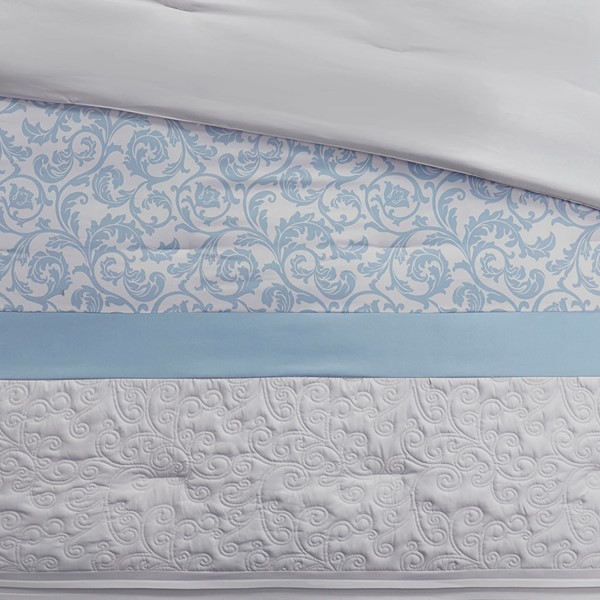 The 510 Design Ramsey Embroidered 8 Piece Comforter Set introduces a graceful elegance to your bedroom decor. A pieced embroidery design with quilting and pintuck details, in blue and grey hues, adorns the face of the comforter and shams, for a beautiful transitional look. Solid Euro shams complement the top of the bed, while 2 embroidered decorative pillows and a solid bed skirt provide the perfect finishing touches to the transitional bedding set. Made from ultra-soft microfiber, this pieced comforter set is machine washable and may come in rolled or compressed packing and will need to be fluffed up. Use a steam iron to help remove wrinkles easier.