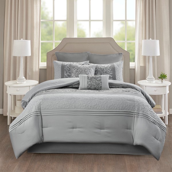 The 510 Design Ramsey Embroidered 8 Piece Comforter Set introduces a graceful elegance to your bedroom decor. A pieced embroidery design with quilting and pintuck details, in grey hues, adorns the face of the comforter and shams, for a beautiful transitional look. Solid Euro shams complement the top of the bed, while two embroidered decorative pillows and a solid bed skirt provide the perfect finishing touches to the bedding set. Made from ultra-soft microfiber, this pieced comforter set is machine washable and may come in rolled or compressed packing and will need to be fluffed up. Use a steam iron to help remove wrinkles easier.