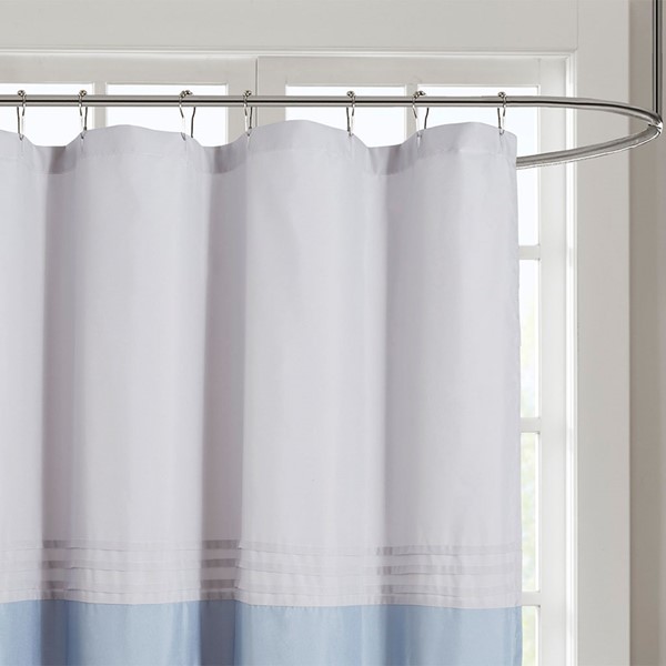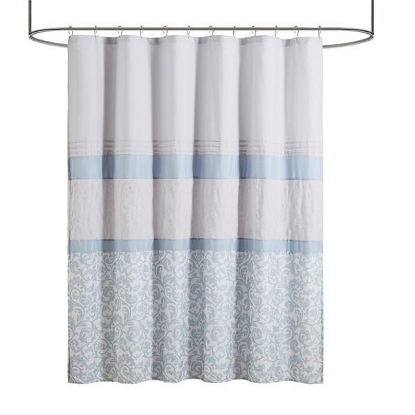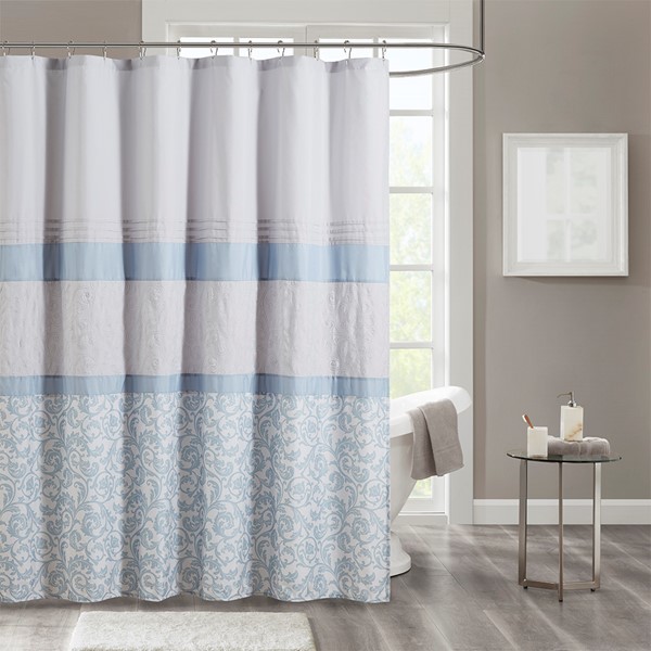 Complete your bathroom with the charm of our 510 Design Ramsey Printed and Embroidered Shower Curtain. This microfiber shower curtain features a printed and pieced design in cool blue hues for a soft and traditional look. Elegantly embroidered details add a sophisticated touch, while an added lining provides better draping and added privacy. Machine washable for easy care, this embroidered shower curtain provides a graceful update to your bathroom decor.