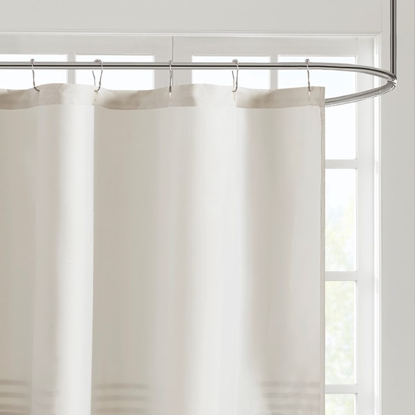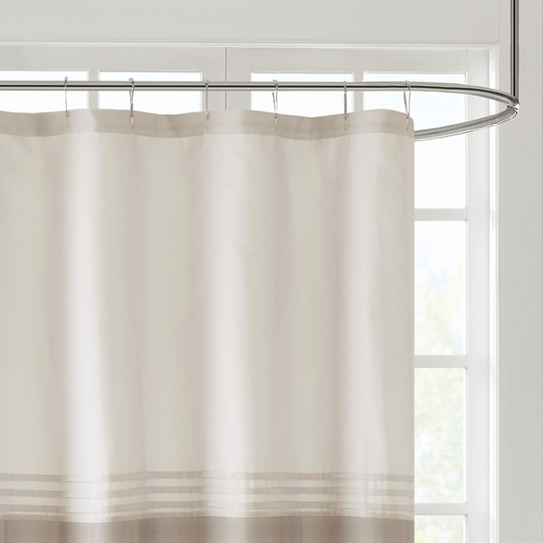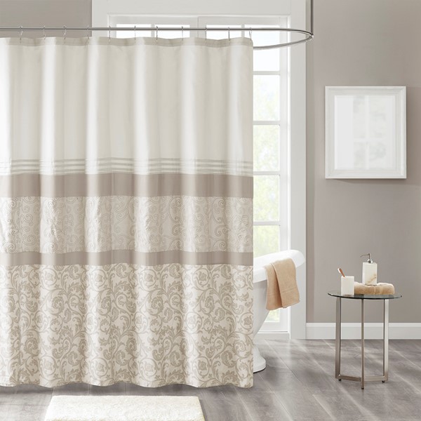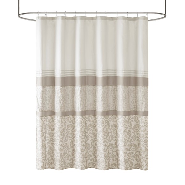 Complete your bathroom with the charm of our 510 Design Ramsey Printed and Embroidered Shower Curtain. This microfiber shower curtain features a printed and pieced design in cool neutral hues for a soft and traditional look. Elegantly embroidered details add a sophisticated touch, while an added lining provides better draping and added privacy. Machine washable for easy care, this embroidered shower curtain provides a graceful update to your bathroom decor.