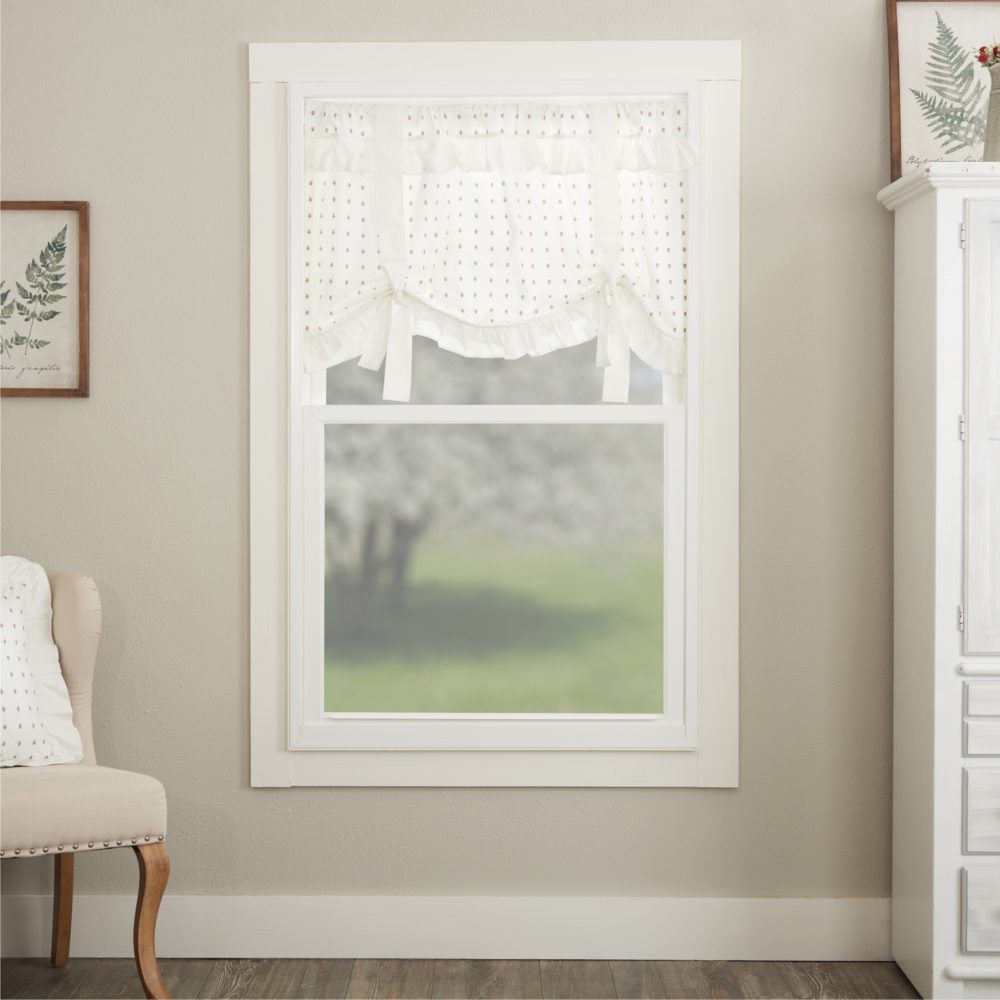 - A gently gathered 3.0 double-layer ruffle, in plain sheeting fabric, adorns the bottom edge of the curtain. Two plain white fabric ties are sewn vertically to the top half of the valance, on the front and back, creating the look of an adjustable Roman Shade. The extra fabric of the ties can then be tied into bows at the bottom of the valance. Fabric loops and a rod pocket provide different display options and with no header, the valance has a clean, tailored top edge.