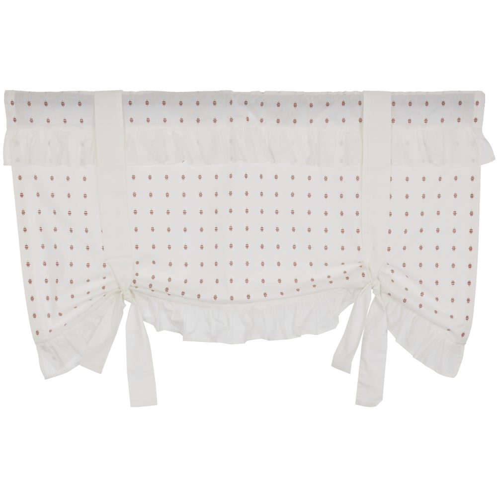 We know you're going to fall in love with the Abigail Collection with its scaled-down symmetrical design in rich, warm tones that repeat in perfect rows across the fabric. The crisp white background accentuates the simple pattern and offers a fresh, clean finish that works beautifully with every design style. The lightweight, breathable cotton brings a sweet, stylish look to windows, filtering the sun's rays softly. A 3.0 double-layer ruffle, in plain sheeting fabric, dresses up the valance 3.0 from the top (under the stitching for the rod pocket) and another double ruffle adorns the bottom 3.0 of the curtain, bringing dimension and a flirty, feminine appeal. Two plain white fabric ties are sewn vertically to the top half of the valance, on the front and back, creating the look of an adjustable Roman Shade. The extra fabric of the ties can then be tied into bows at the bottom of the valance. Fabric loops and a rod pocket provide different display options.