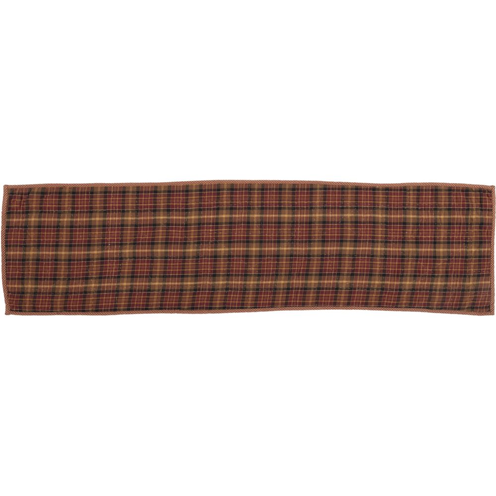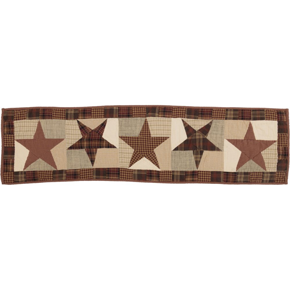 Create a warm and welcoming table for friends and family to gather round with primitive colors and quilted details. The Abilene Star Quilted Runner includes one table runner measuring 13x48 inches made from 100 percent cotton. Warm and rich tones of burgundy, tan and dark brown are joined in array of classic checks and tartan plaid prints in a rustic patchwork with a soft feel. At the center of the design is a series of bold, 5-point stars for an elegant, Americana look. The classic country table runners reverse to a burgundy and tan tartan plaid with soft country black striping. Complete your tabletop decor with other pieces from the Abilene Star Collection by VHC for a coordinated modern primitive look.