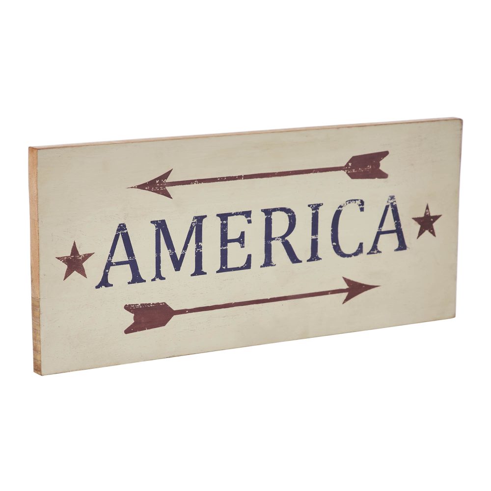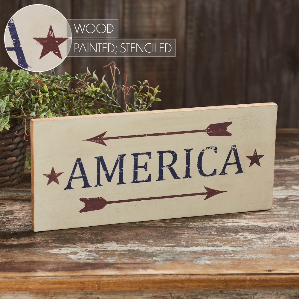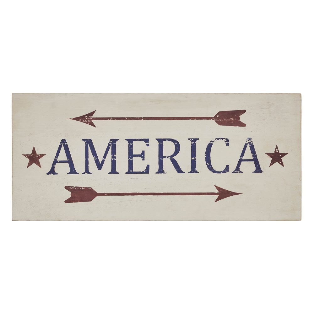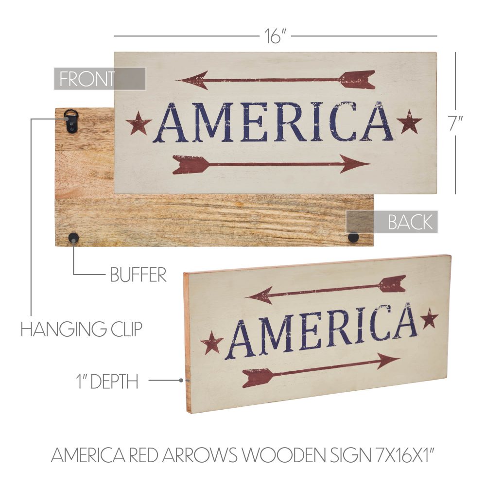 - America Red Arrows Wooden Sign: Embrace the patriotic spirit with the VHC Brands Patriotic America Red Arrows Wooden Sign, a captivating 16×7 piece designed to enhance your Independence Day decor. Crafted from tropical wood, this sign seamlessly combines Americana charm with rustic allure.