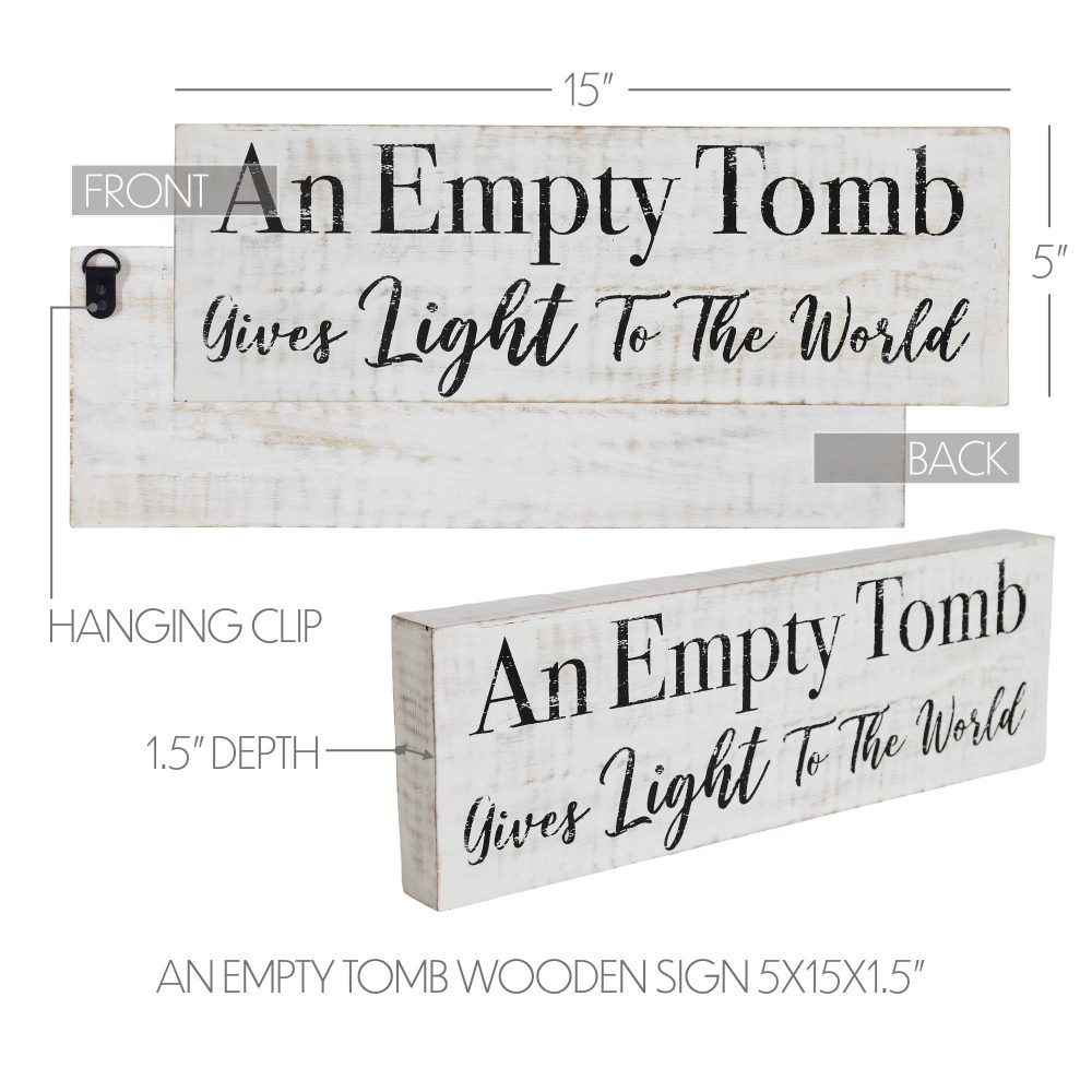 - Symbolic Design: Embrace the essence of Easter and spring decor with this symbolic 5×15-inch wooden sign from the Risen Collection, featuring “An Empty Tomb Gives Light To The World” in Nickel Grey against a Light Creme backdrop.