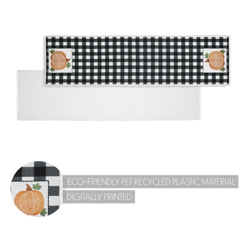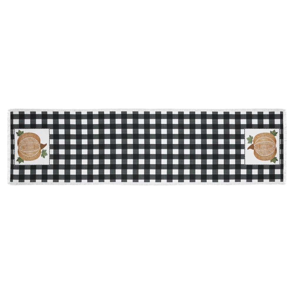 - KEY FEATURES & SPECIFICATIONS: Introduce timeless autumnal elegance to your kitchen or dining area with this 12×48 inch Farmhouse Black White Buffalo Plaid Pumpkin Table Runner, skillfully crafted from durable fabric. This piece showcases a classic black and white buffalo plaid foundation, beautifully accented with vintage-inspired pumpkins bursting in rich burnt orange with delicate olive green leaves, and finished with a unique, lovingly frayed edge that evokes the charm of well-loved textiles.