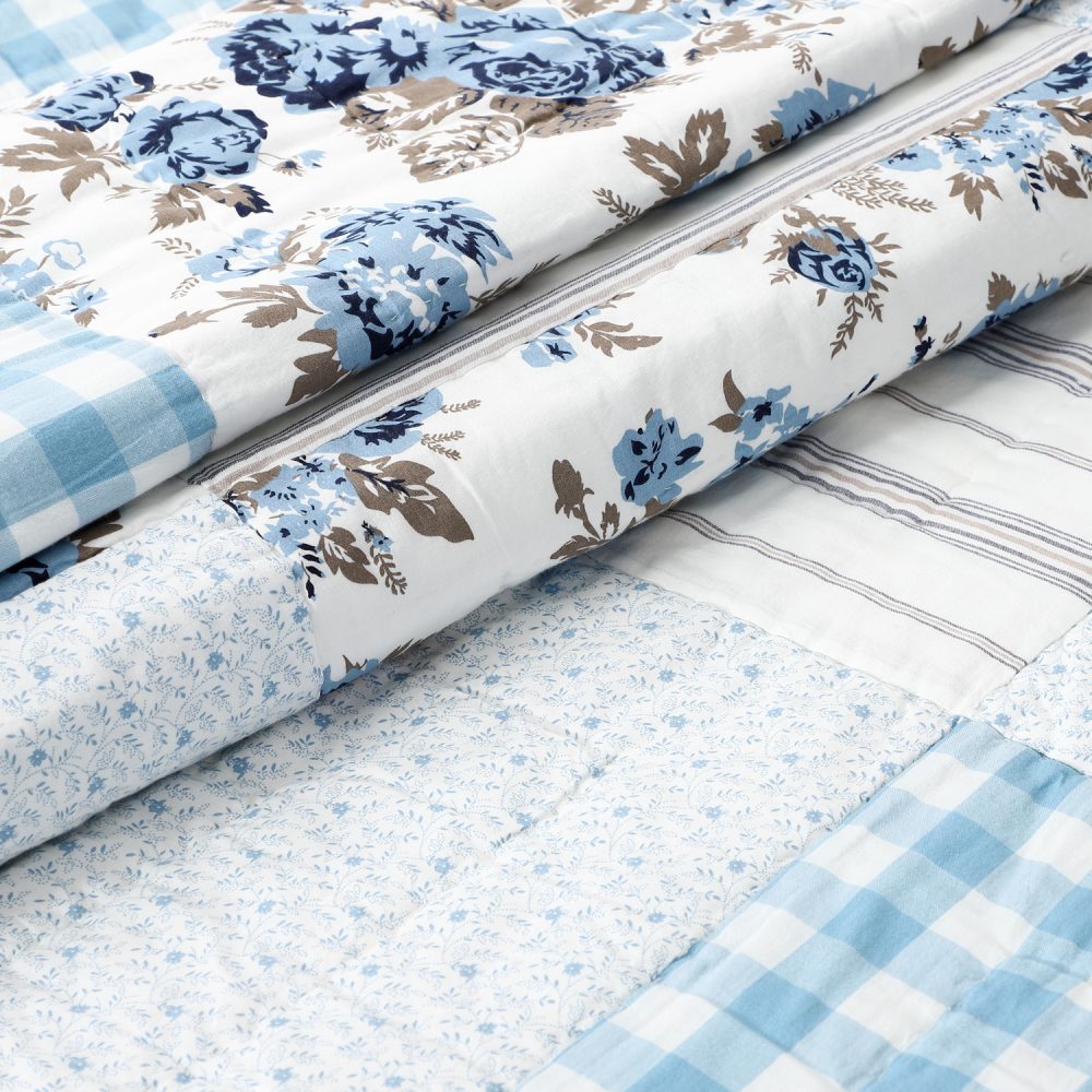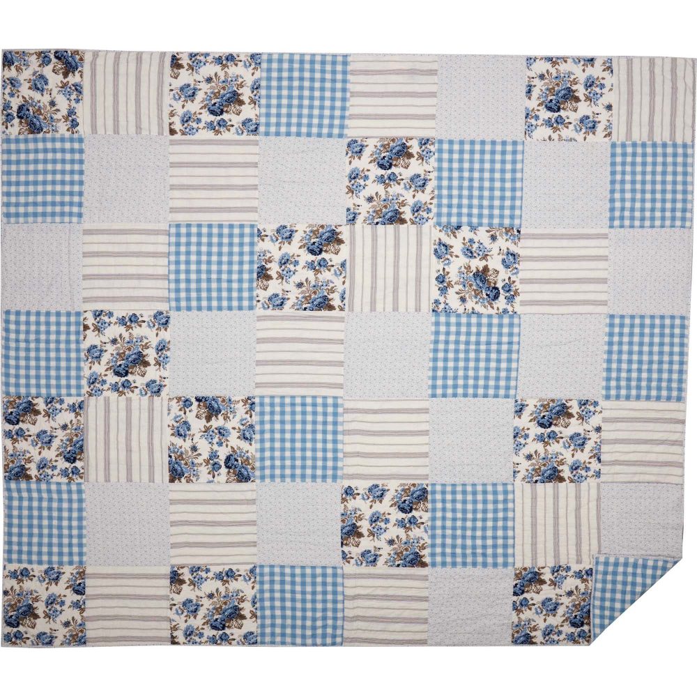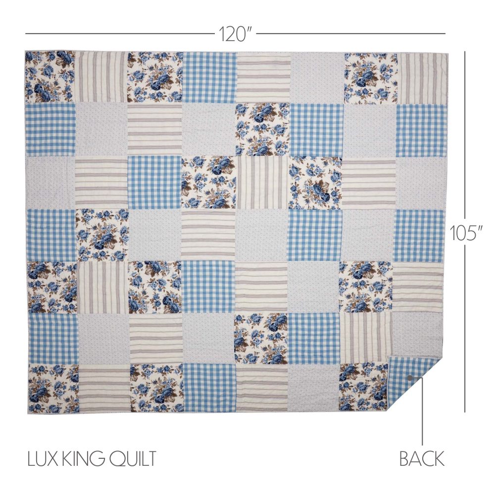 Vintage patterns in calming colors produce a cozy quilt you will want to snuggle into night after night. The Annie Blue Floral Patch Luxury King Quilt measures 120 by 105 inches. The classic country blanket features a patchwork design with blocks stitched with Stitch in the Ditch and Echo quilting techniques for superior durability. Blocks feature an array of patterns, including buffalo plaid, stripes and vintage-inspired florals in white, dusk blue, and portabella brown. Reverses to solid dusk blue and white buffalo plaid. Constructed with a 100 percent cotton shell with cotton batting for extra warmth. Machine washable and iron safe. Comes pre-washed for additional softness. Coordinates with the Annie Blue Floral Collection by VHC for vintage farmhouse style.