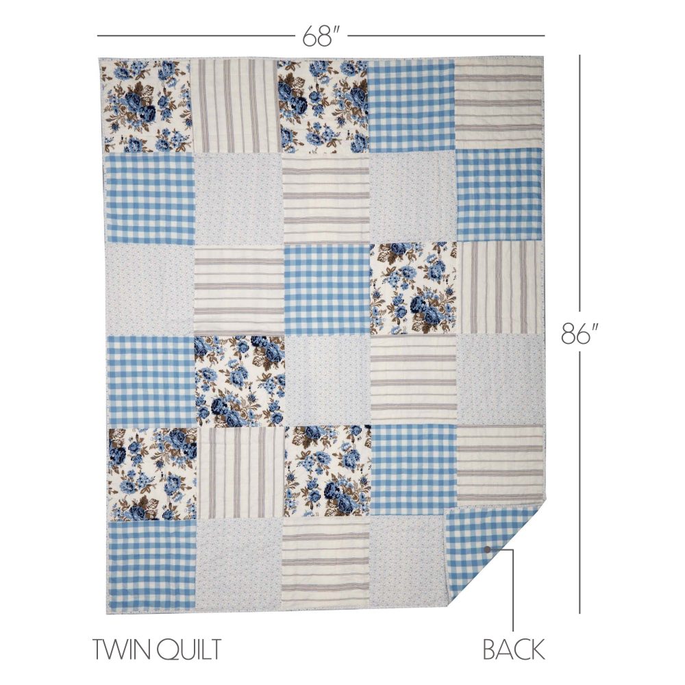 Vintage patterns in calming colors produce a cozy quilt you will want to snuggle into night after night. The Annie Blue Floral Patch Twin Quilt measures 68 by 86 inches. The classic country blanket features a patchwork design with blocks stitched with Stitch in the Ditch and Echo quilting techniques for superior durability. Blocks feature an array of patterns, including buffalo plaid, stripes and vintage-inspired florals in white, dusk blue, and portabella brown. Reverses to solid dusk blue and white buffalo plaid. Constructed with a 100 percent cotton shell with cotton batting for extra warmth. Machine washable and iron safe. Comes pre-washed for additional softness. Coordinates with the Annie Blue Floral Collection by VHC for vintage farmhouse style.