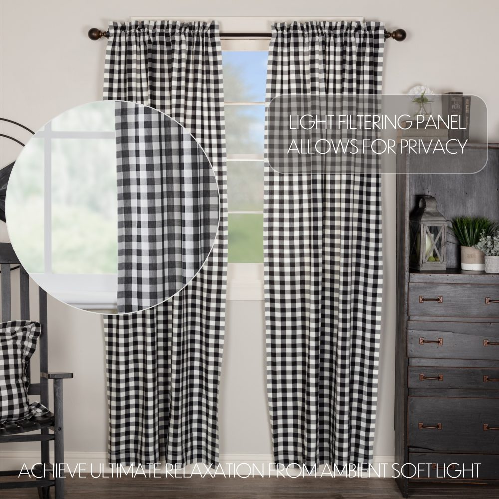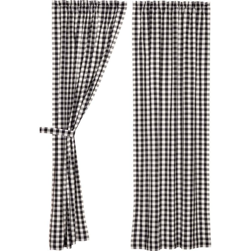 - BUFFALO CHECK CURTAIN: Includes two 84 by 40 inch 100% cotton window panels with a 2-inch header and a 3.25-inch rod pocket. Includes two matching tiebacks.