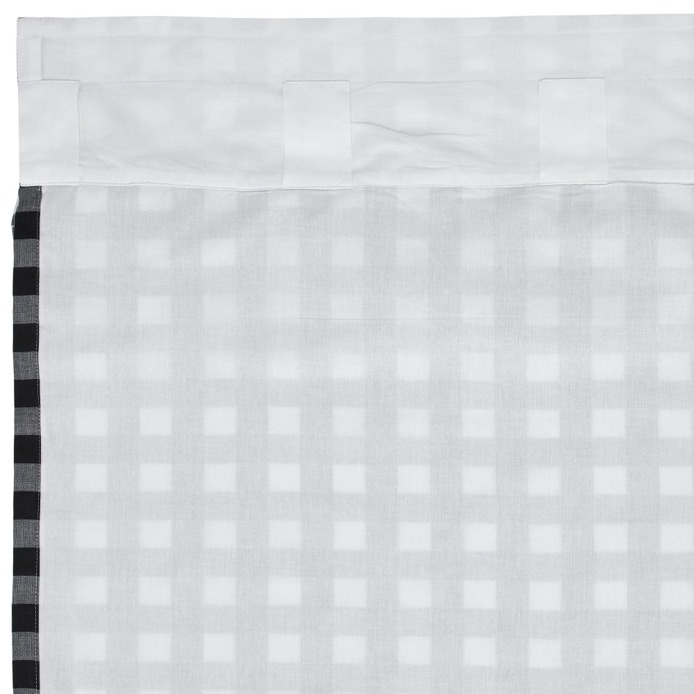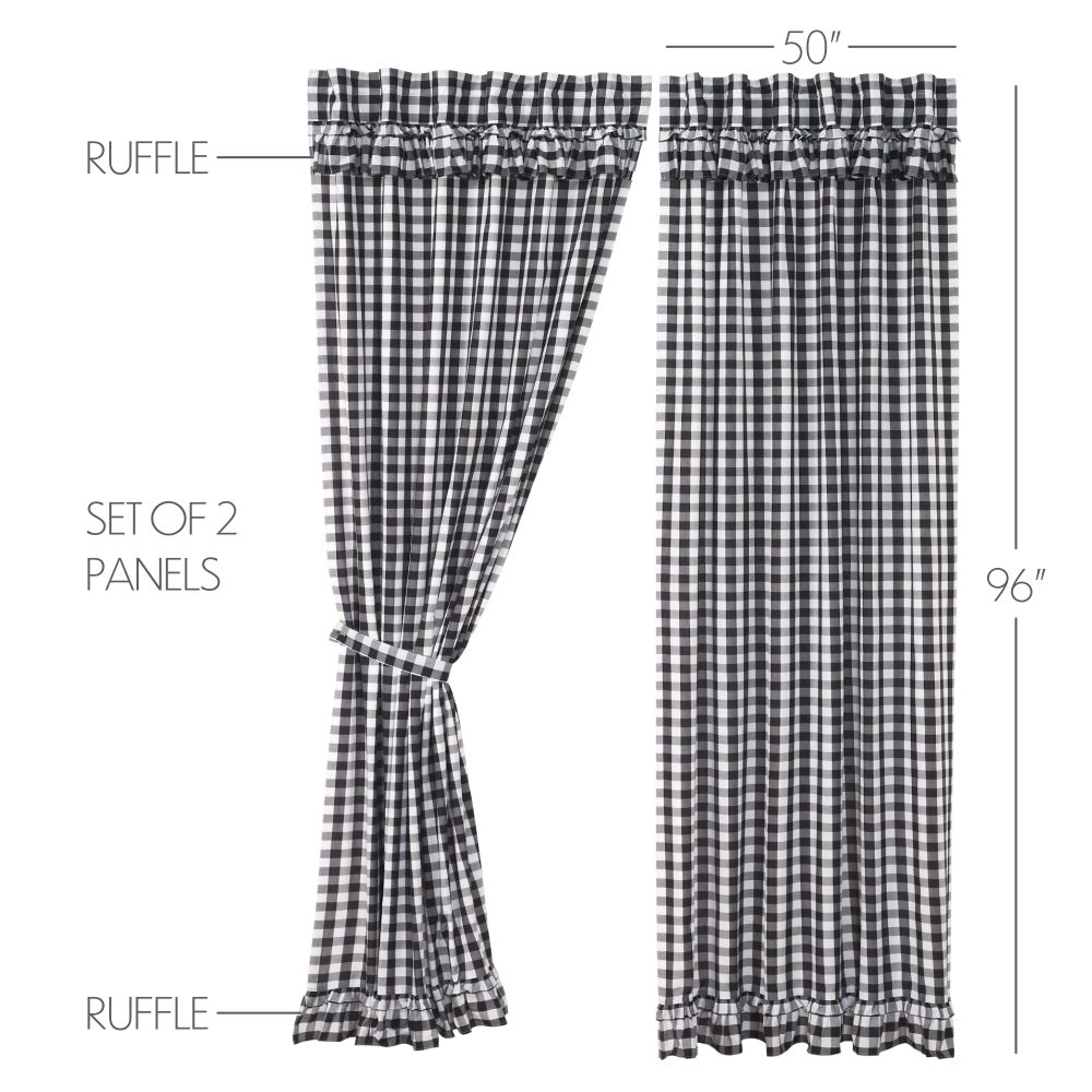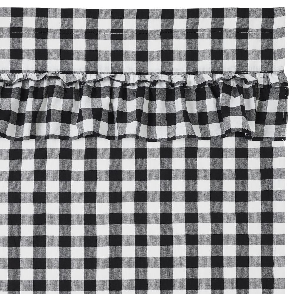 Decorate your windows with a touch of classic, farmhouse style with this romantic set of two 96x50 ruffled window panels. Displaying timeless country design with large-scale black and white checks and ruffled edging, the Annie Buffalo Black Check Panel 96x50 enhances your home decor with fun, cozy appeal. This 100% cotton curtain has a white lining to prevent fading and provide additional privacy. It includes a rod pocket and loops for easy hanging. Includes two matching tie backs.
