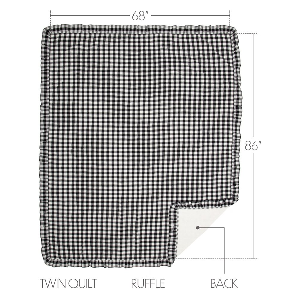 Feel right at home in cozy, country comfort with the Annie Buffalo Black Check Ruffled Twin Quilt Coverlet. Patterned with black and antique white buffalo checks and trimmed with gathered ruffles, our 68Wx86L quilt is created using exquisite cotton and quality diamond stitching. This elegant farmhouse quilt brings lighthearted, sophistication to your bedroom decor and reverses to a soft white. Our quilt is prewashed for your convenience, and both machine washable and iron-safe.