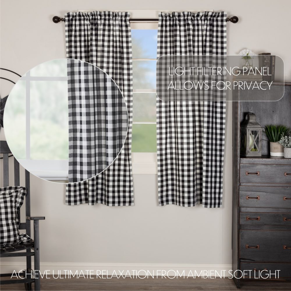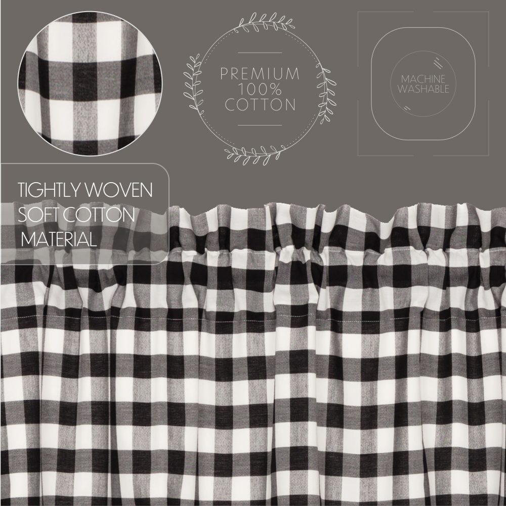 Decorate your windows with a touch of farmhouse style with this classic set of two 63x36 window panels. Displaying timeless country design with large-scale black and white checks, the Annie Buffalo Black Check Short Panel 63x36 enhances your home decor with fun, cozy appeal. This 100% cotton curtain has a white lining to prevent fading and provide additional privacy. It includes a rod pocket and loops for easy hanging. Includes two matching tie backs.
