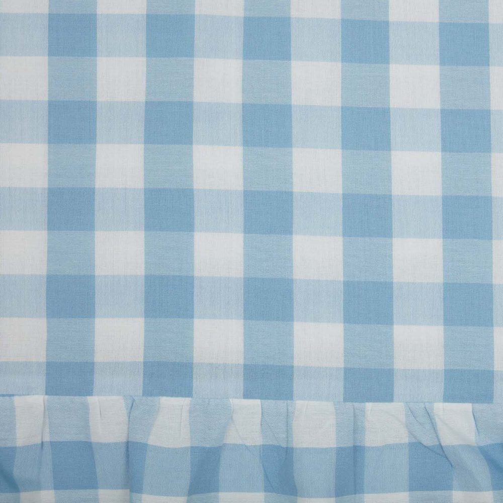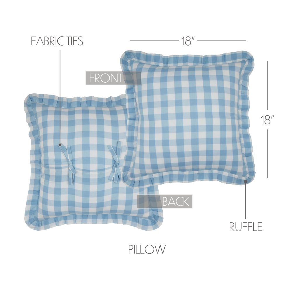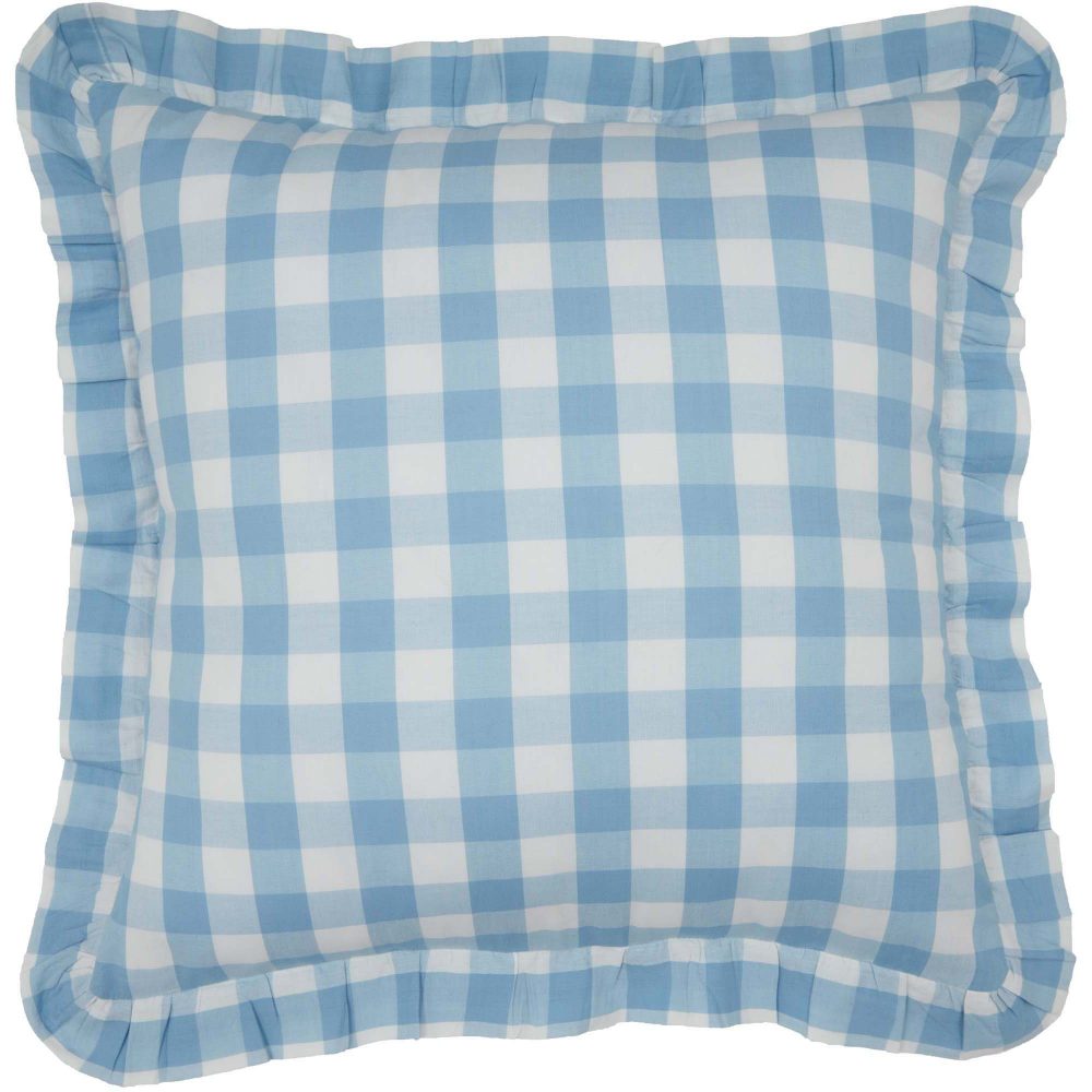 White and dusk blue in buffalo check plaid create a classic look for traditional farmhouse home decor. The Annie Buffalo Blue Checked Ruffled Fabric Pillow measures 18x18 inches and includes a removable cover with tie-style closures. The removeable cotton pillowcase includes a polyester fill. Ruffled edging adds a soft, elegant finishing detail. Add to an entryway bench or soften a rocking chair with ease. Pair with other pieces from the Annie Buffalo Collection for a complete look or mix with other modern farmhouse decor. Machine washable and iron safe.