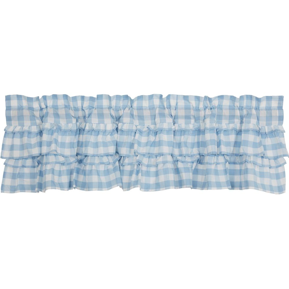 Brighten up your windows with cozy elegance and vintage charm. Our Annie Buffalo Blue Check Ruffled Valance Curtain 16x60 features classic buffalo check in light blue and soft white, gracefully trimmed with ruffles. Finished with a white cotton lining to help filter light and prevent fading. Includes a rod pocket for simple hanging.