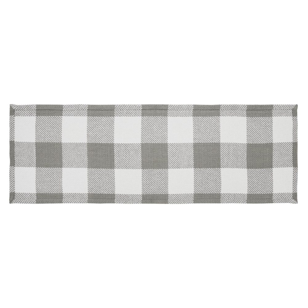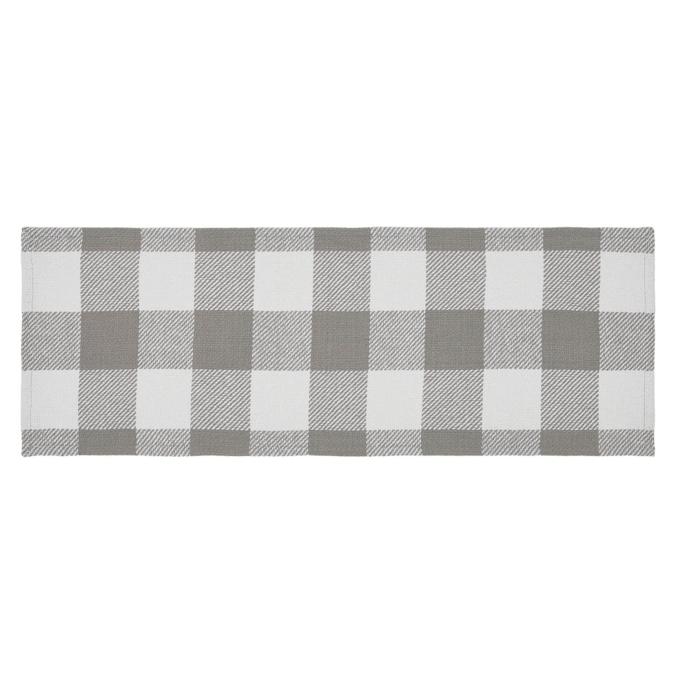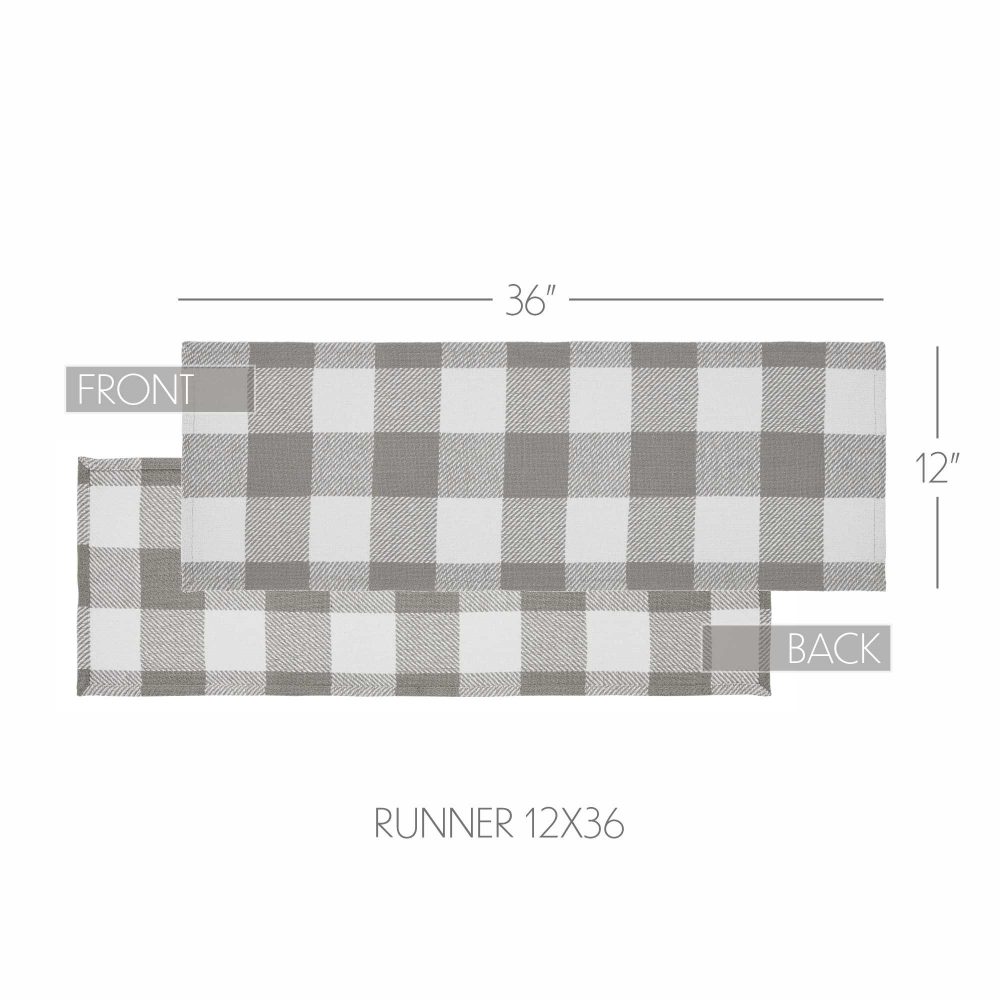 - Enhance your Country Farmhouse decor with the 12×36-inch Annie Buffalo Check Collection table runner in Ash Grey.
