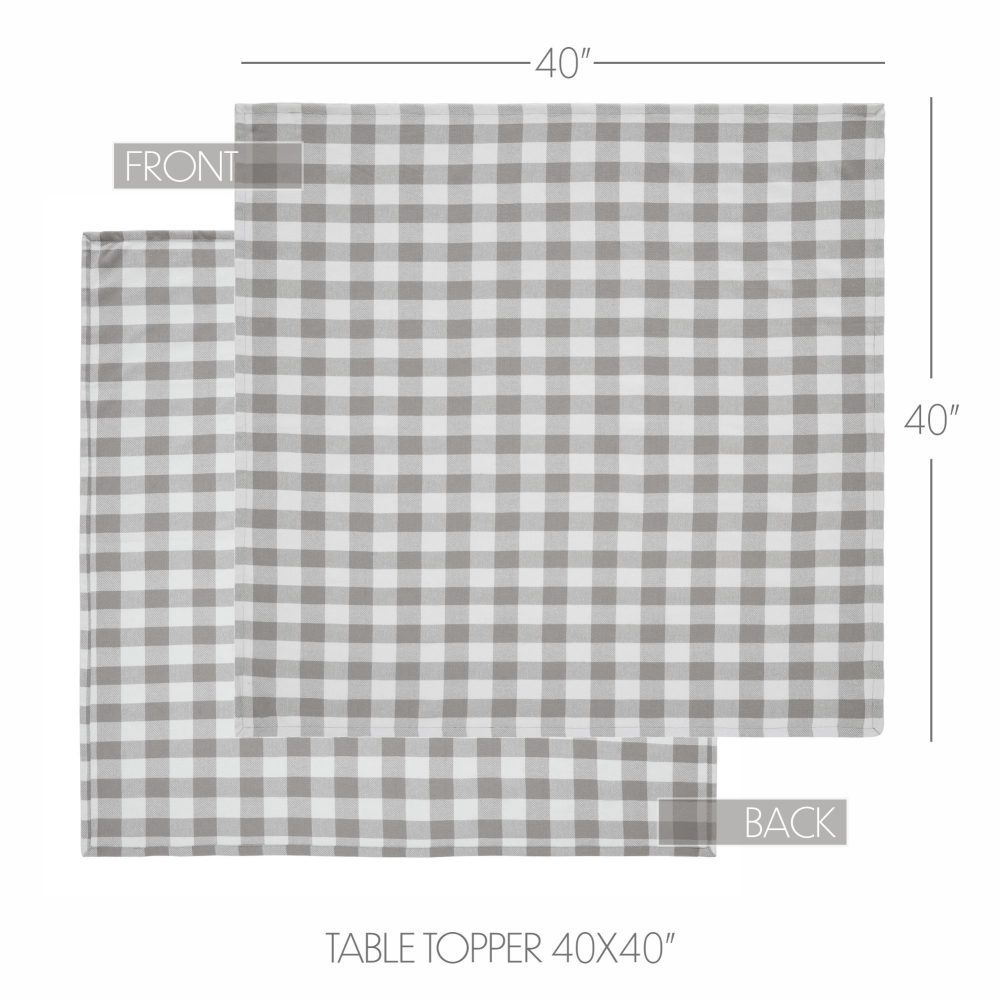 - The VHC Brands Annie Buffalo Check Grey Table Topper, measuring a generous 40×40 inches, adds a farmhouse-style touch to your kitchen and dining room decor.