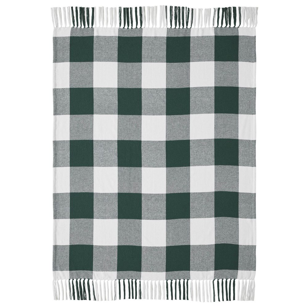 - Bring farmhouse charm to your bedroom and living room decor with the Annie Buffalo Check Hunter Green Woven Throw, measuring 50×60 inches.