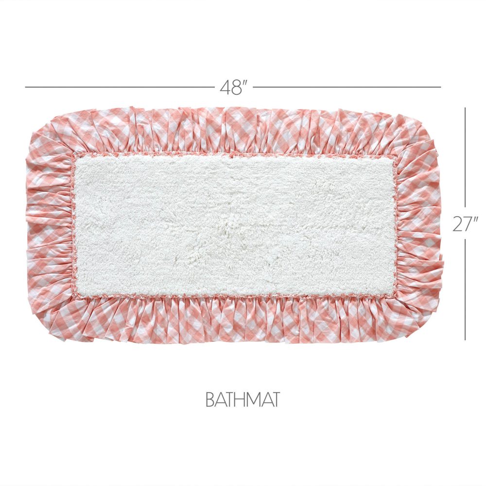 - PREMIUM BATH MAT: A high-quality core provides a thick cushion to sink your feet into and durable cotton to absorb water providing a safe and comfortable post-shower landing. The large 27 by 48 inch rug features a ruffled edge in a soft coral check.