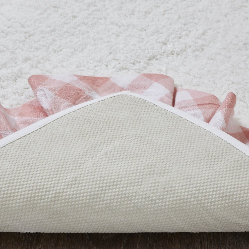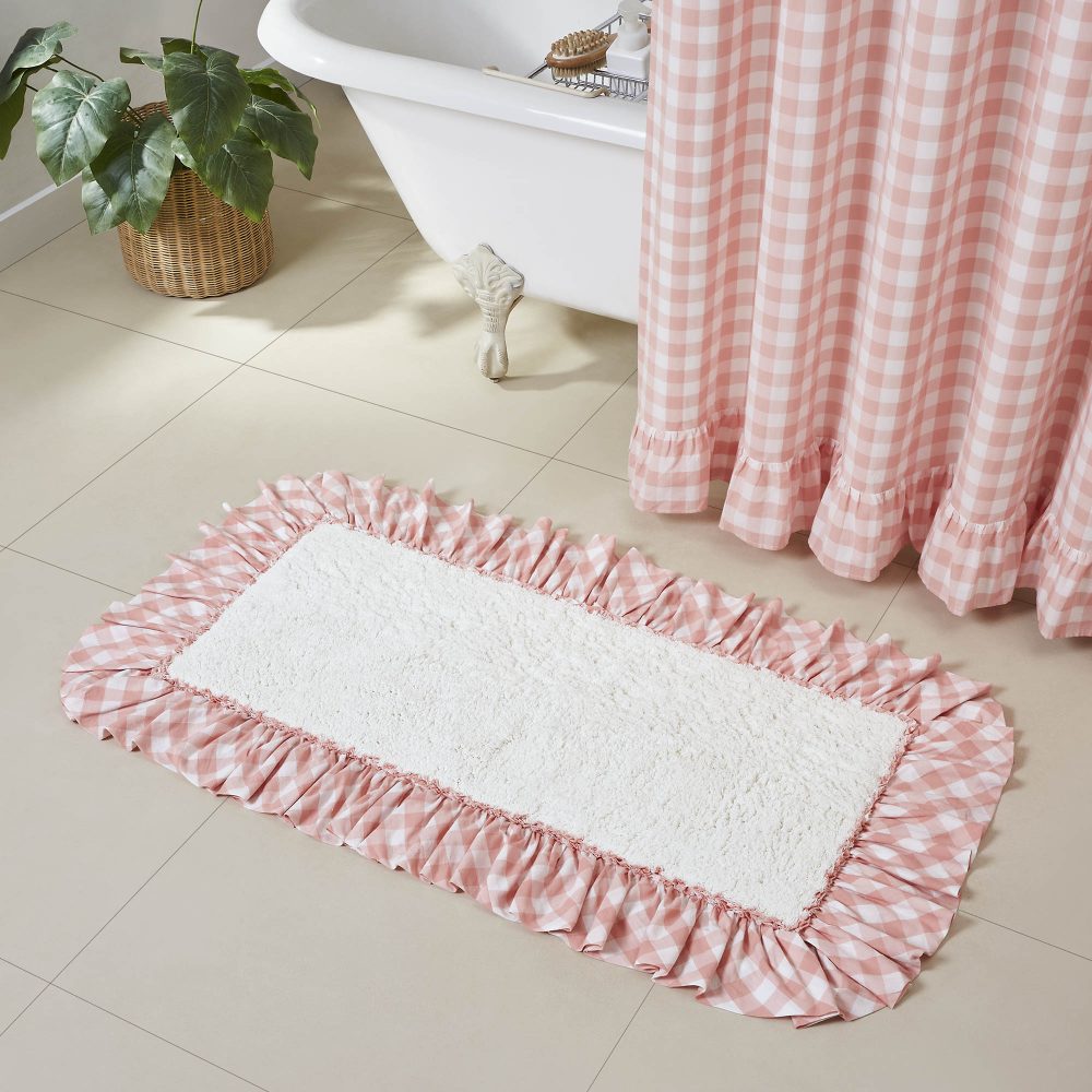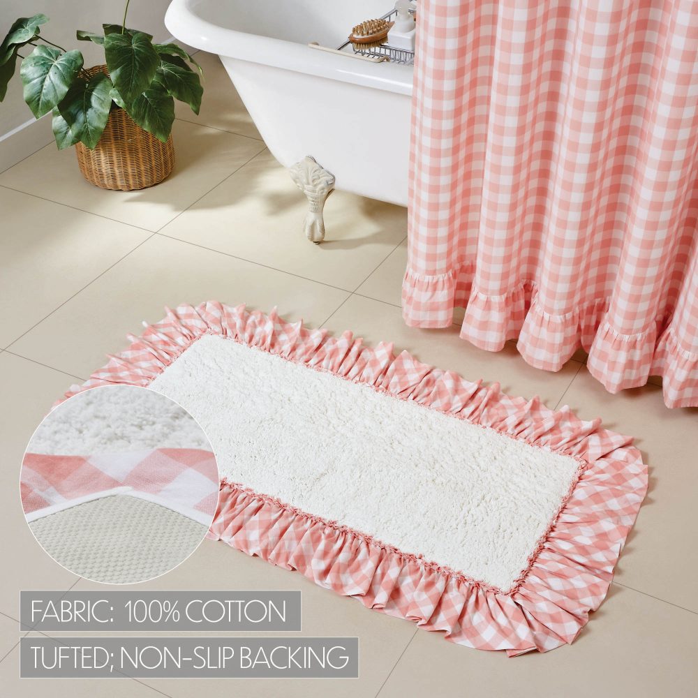Step out of the shower and into cozy country farmhouse bliss. The Annie Buffalo Check Coral Bath Mat 27x48 features a solid white core in premium, ultra absorbent cotton. It is trimmed with a ruffled checked plaid fabric in a soft, pink-tinged coral and white. Backed with textured rubber to produce a quality, non-slip surface without the need for a separate rug pad. This ruffled bath mat is a great finishing piece for bathrooms or laundry rooms where you need the perfect balance of style and functionality.