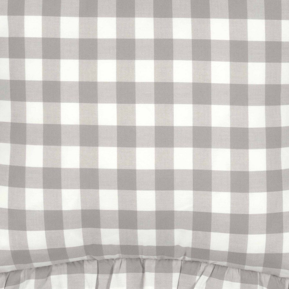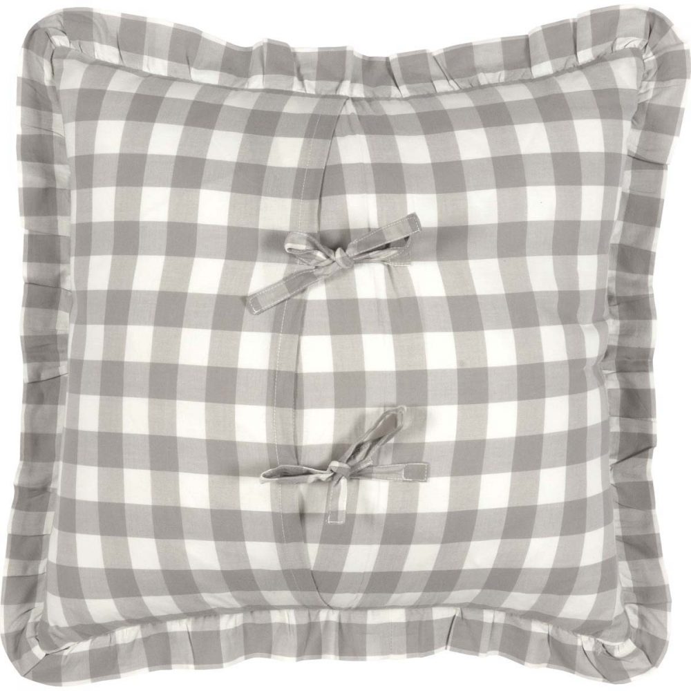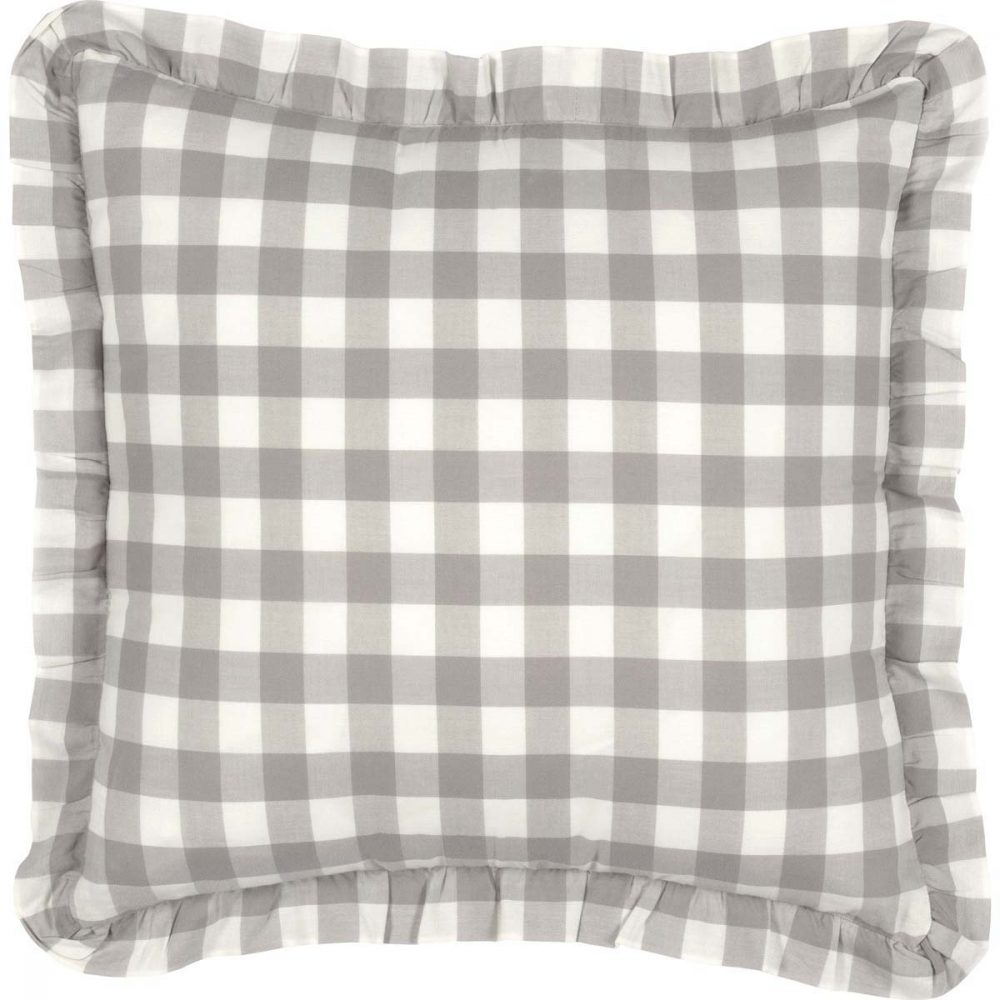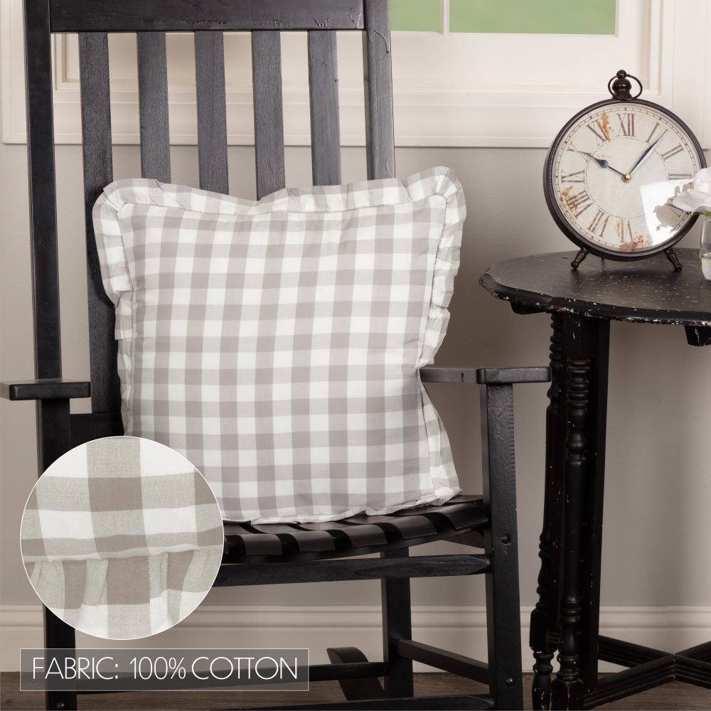 White and ash grey in buffalo check plaid create a classic look for traditional farmhouse home decor. The Annie Buffalo Grey Checked Ruffled Fabric Pillow measures 18x18 inches and includes a removable cover with tie-style closures. The removeable cotton pillowcase includes a polyester fill. Ruffled edging adds a soft, elegant finishing detail. Add to an entryway bench or soften a rocking chair with ease. Pair with other pieces from the Annie Buffalo Collection for a complete look or mix with other modern farmhouse decor. Machine washable and iron safe.