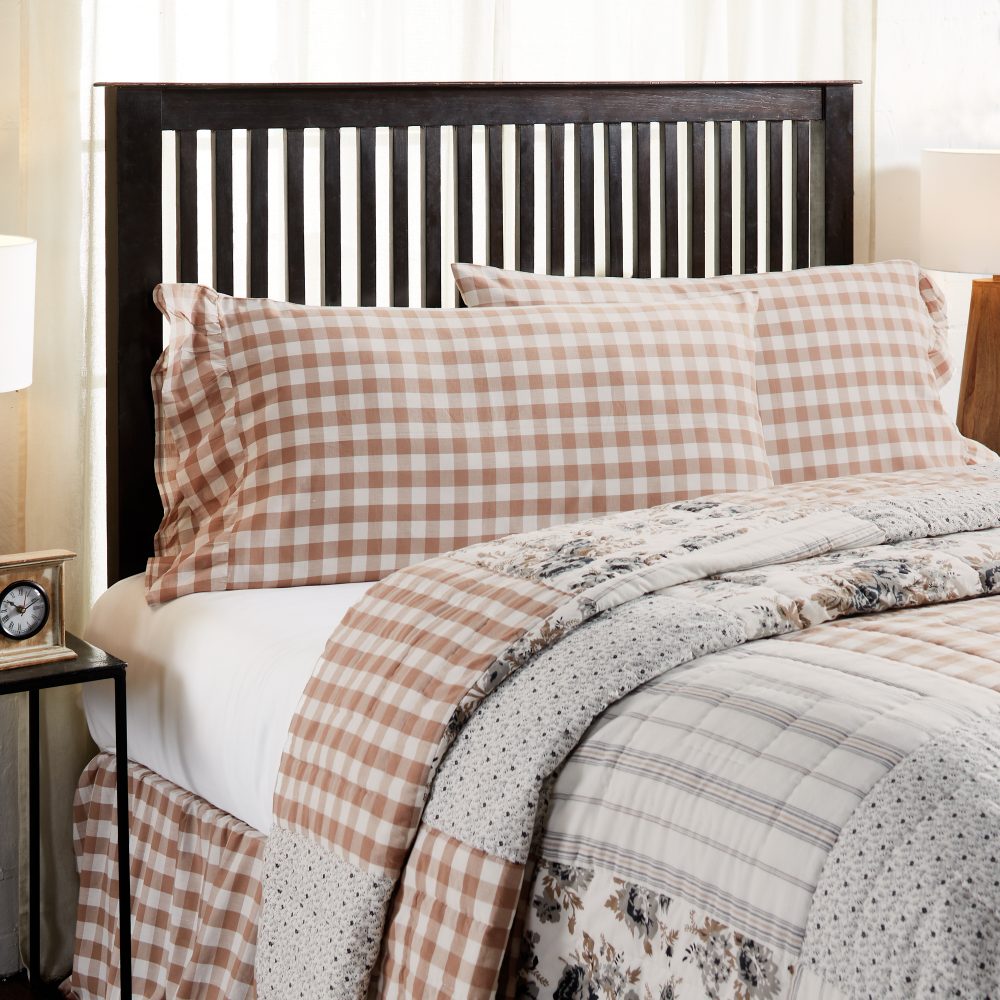 Accent your farmhouse bedroom with classic gingham patterns and soft ruffles for a big helping of country charm. The Annie Buffalo Portabella Check King Pillow Case Set includes two 21x36 pillow covers with additional 4-inch ruffles at the opening. Ruffled pillow cases are a great way to add a finishing touch to farmhouse bedding for a perfectly cozy and put-together feel. This cotton pillow slip set includes a delightful large-scale buffalo check pattern in portabella brown and soft white. The set features double-sewn seams for extra durability as well as extra length to ensure good coverage of your fill pillow (not included). Coordinates with the Annie Buffalo Collection by VHC for a complete country farmhouse look. Machine washable and iron safe.