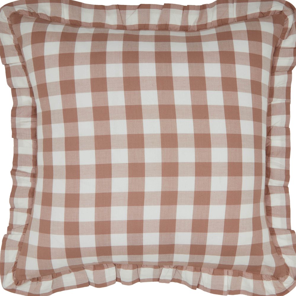 White and portabella brown in buffalo check plaid create a classic look for traditional farmhouse home decor. The Annie Buffalo Portabella Checked Ruffled Fabric Pillow measures 18x18 inches and includes a removable cover with tie-style closures. The removeable cotton pillowcase includes a polyester fill. Ruffled edging adds a soft, elegant finishing detail. Add to an entryway bench or soften a rocking chair with ease. Pair with other pieces from the Annie Buffalo Collection for a complete look or mix with other modern farmhouse decor. Machine washable and iron safe.