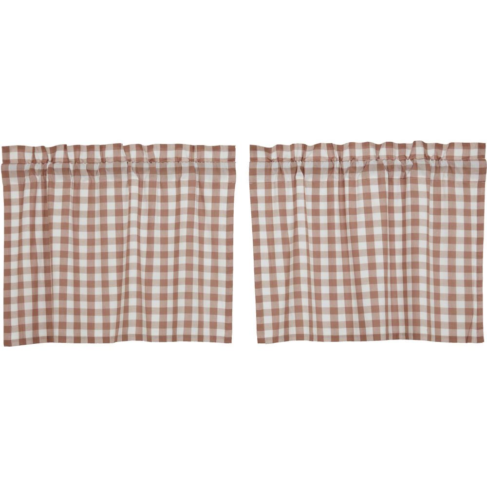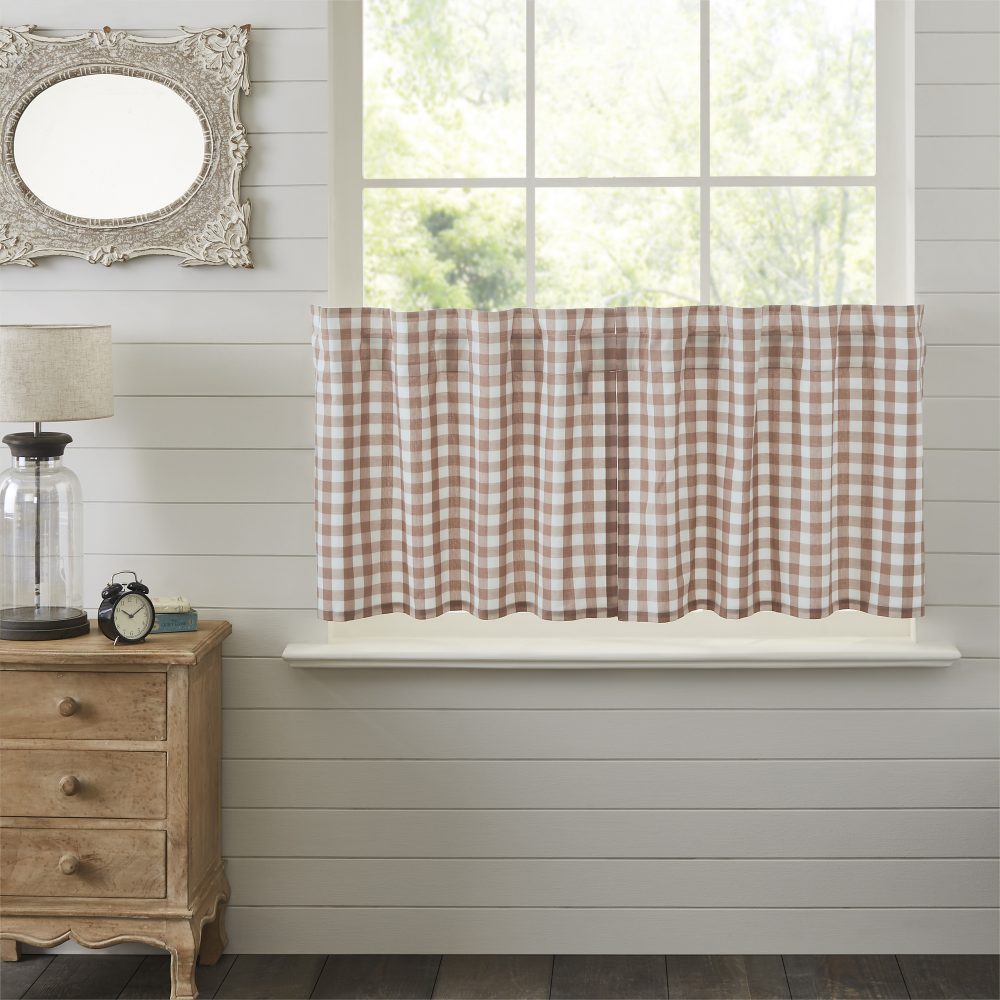 Create the perfectly charming country window of your dreams with these 24x36 inch tier-style curtains. Featuring portabella brown and white buffalo plaid, these short curtains provide just the right balance of privacy and sunshine. Pair with matching valances or prairie swag for a fully decorated look or alone for a simple pop of color and character. Also known as cafe or bistro curtains, these are a particularly good fit for decorating vintage kitchens, laundry rooms, and small bathroom windows.