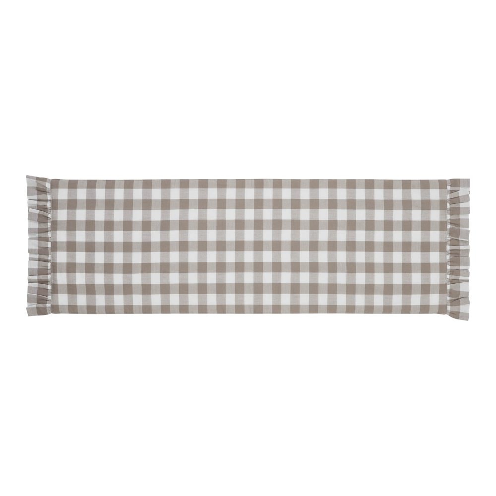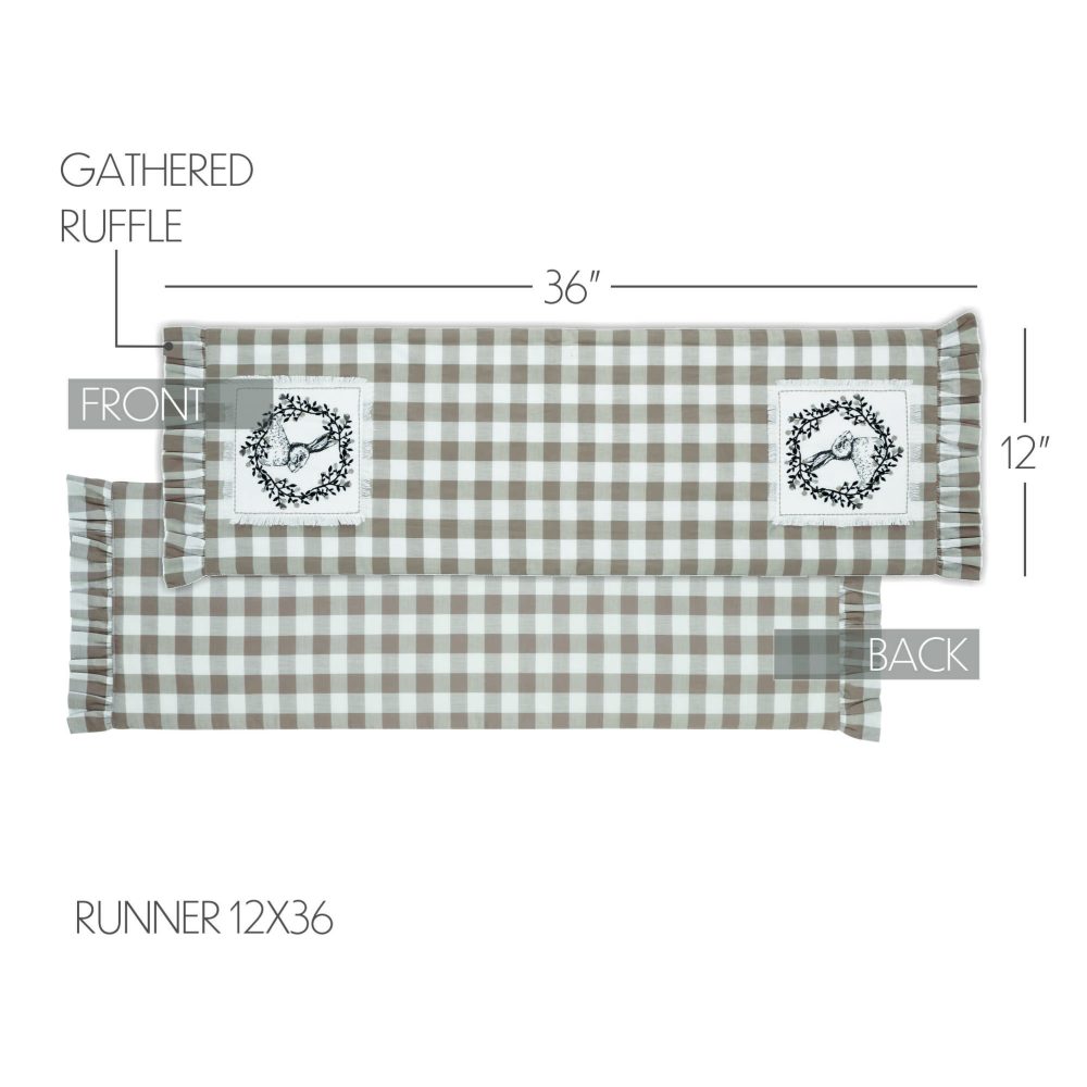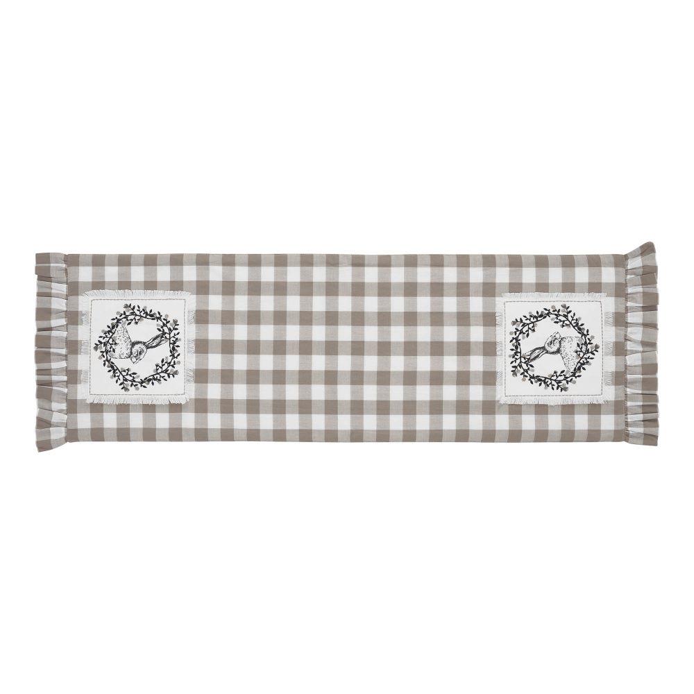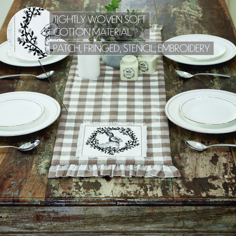 Add warm vintage style to your spring decor with portabella buffalo check plaid and a charming rabbit and wreath design. The Annie Buffalo Portabella Check Vintage Hare Table Runner measures 12x36 inches to add Spring style to your small accent or coffee tables. The soft cotton table runner includes a wide ruffle on either end for elegant style. Coordinates with the Annie Buffalo Portabella Collection by VHC for charming, vintage-inspired style for all of your country farmhouse decor needs.