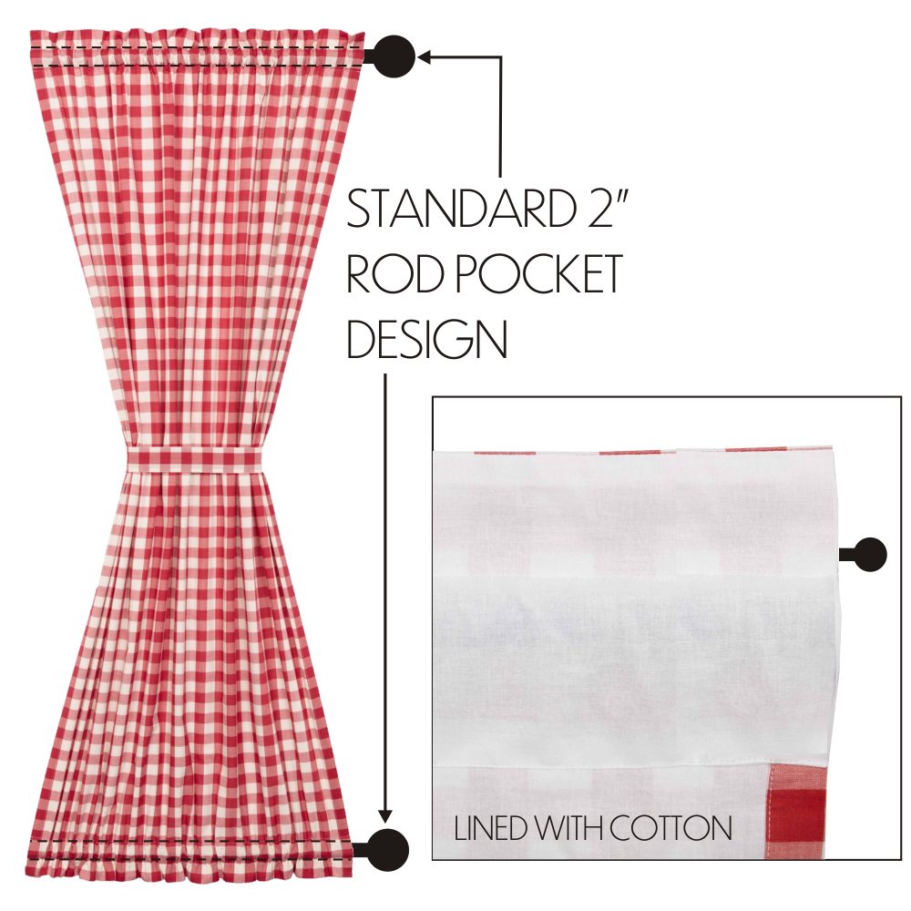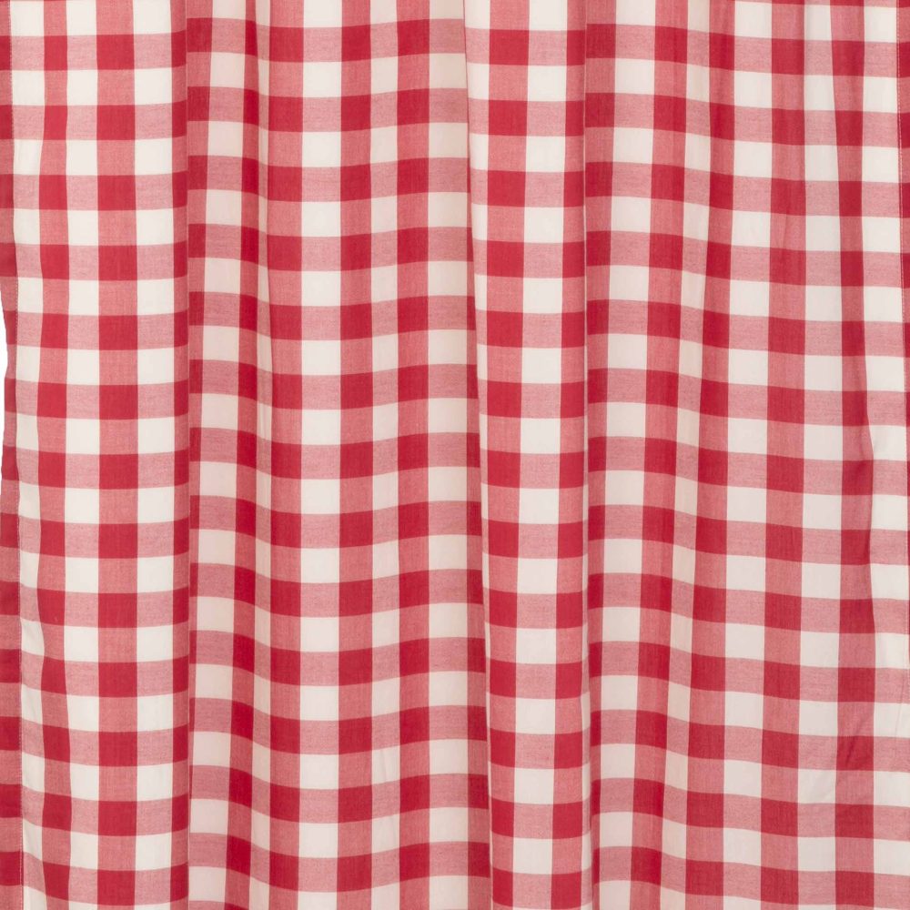 Decorate your windows with a touch of farmhouse style with this classic door panel. Displaying timeless country design with large-scale red and white checks, the Annie Buffalo Red Check Door Panel 72x40 adds privacy to door windows while enhancing the style of your room. This 100% cotton curtain has a white lining to prevent fading and provide additional privacy. It includes two rod pockets for easy hanging and a matching tieback with a button to wrap around the center for additional styling options.