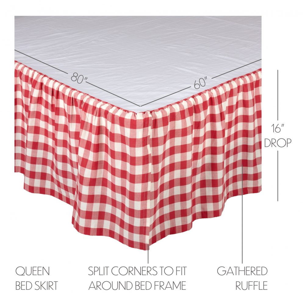 Practical and stylish, bedskirts add a perfect finishing touch to your bedding while covering bed posts, under-bed storage and preventing accumulation of dust in hard-to-clean spaces. The Annie Buffalo Red Check Queen Bedskirt is a casual decor staple with country-favorite buffalo plaid and classic red and antique white coloring for crisp farmhouse charm. The 60x80-inch bed ruffle features a generous 16-inch drop to ensure that the fabric reaches your floor for a neat, put-together look. VHC bedskirts are also designed with split corners and slight ruffling for less fuss and a great fit every time. Made of 100 percent cotton. Coordinates with the Annie Buffalo Check Collection by VHC for a complete modern farmhouse look for your bedroom. Machine washable and iron safe.