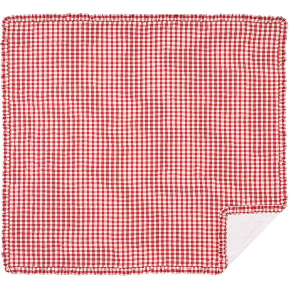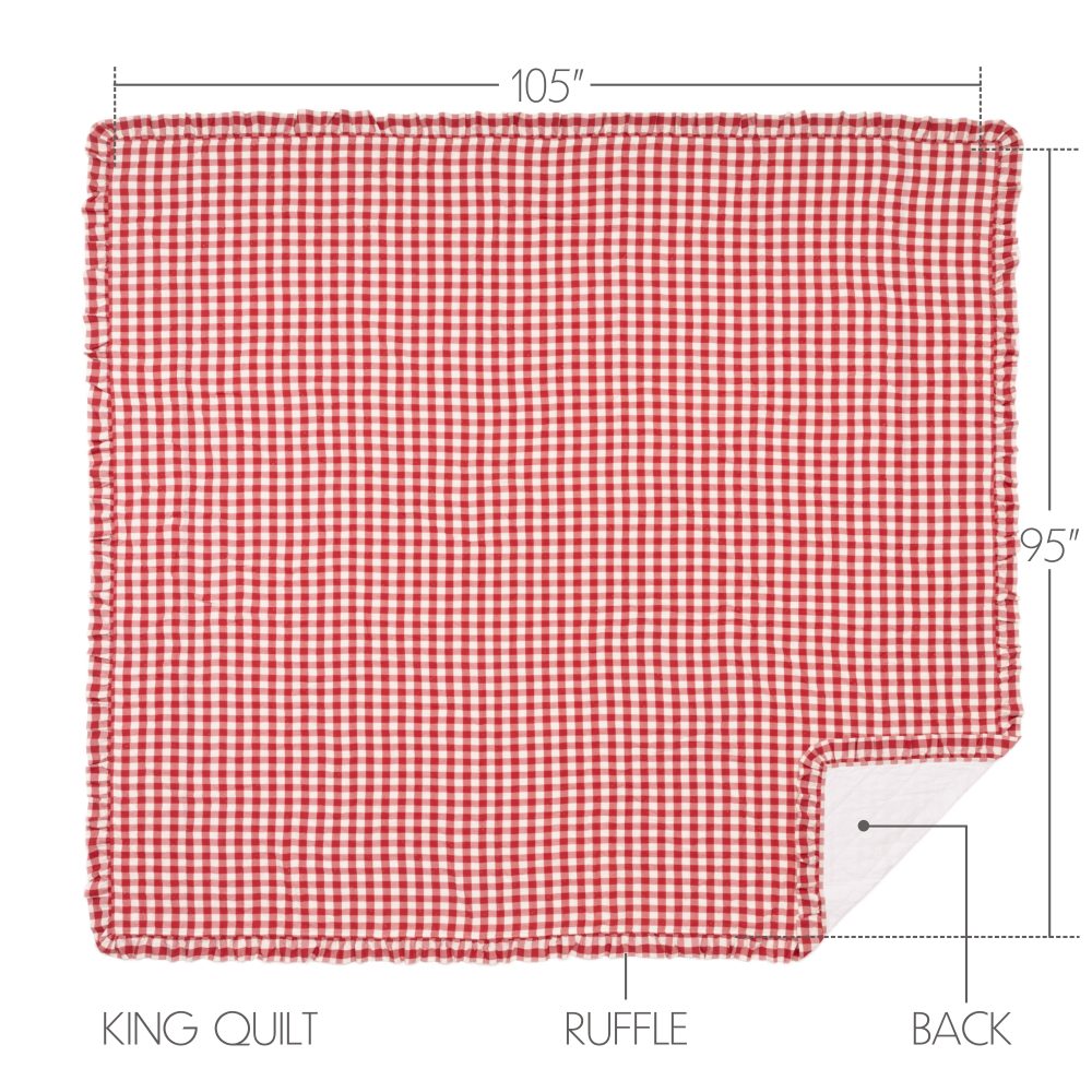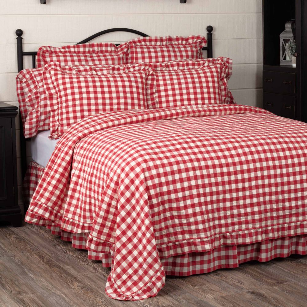 Feel right at home in cozy, country comfort with the Annie Buffalo Red Check Ruffled King Quilt Coverlet. Patterned with red and antique white buffalo checks and trimmed with gathered ruffles, our 105Wx95L quilt is created using exquisite cotton and quality diamond stitching. This elegant farmhouse quilt brings lighthearted, sophistication to your bedroom decor and reverses to a soft white. Our quilt is prewashed for your convenience, and both machine washable and iron-safe.