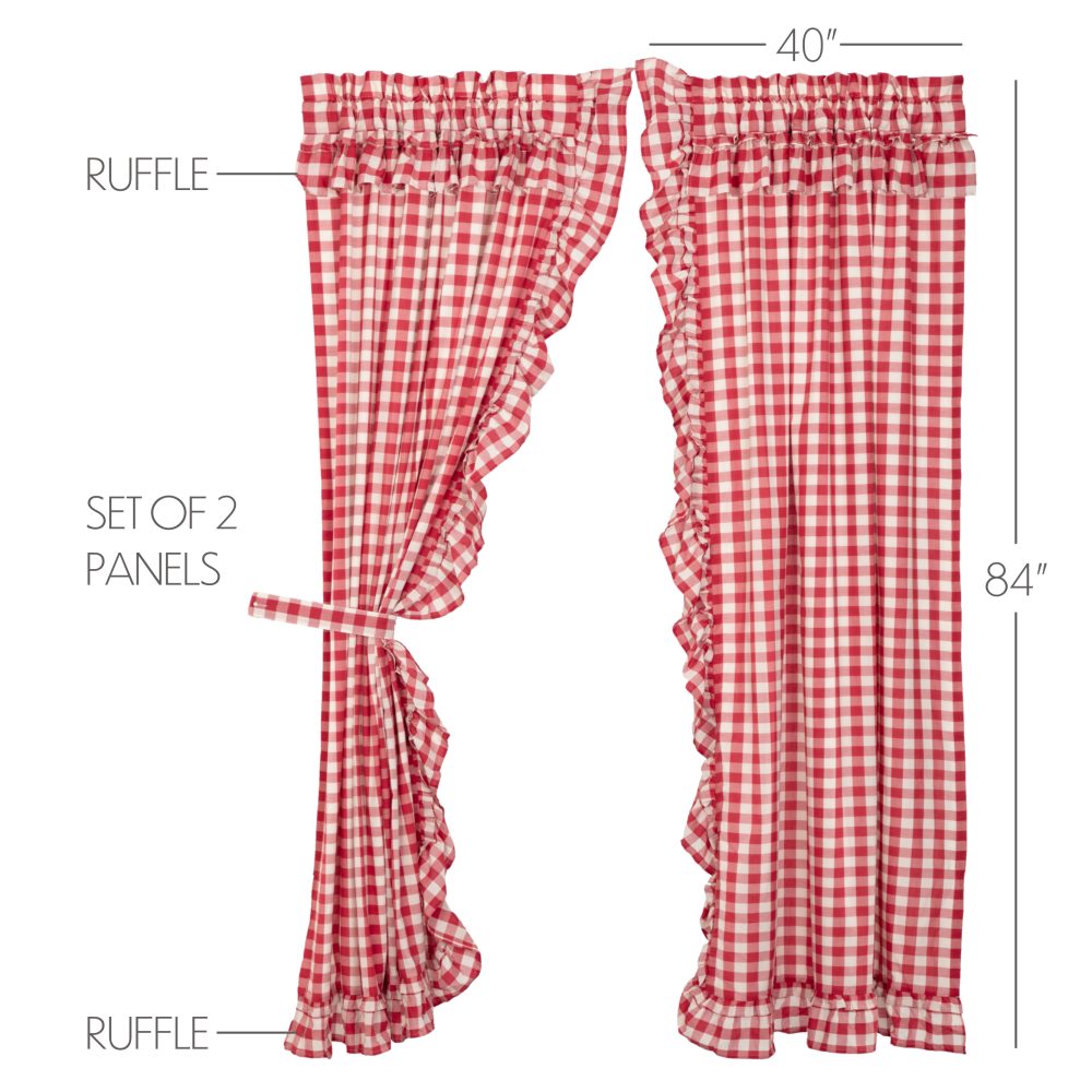 Decorate your windows with a touch of classic, farmhouse style with this romantic set of two 84x40 ruffled window panels. Displaying timeless country design with large-scale red and white checks and ruffled edging, the Annie Buffalo Red Check Panel 84x40 enhances your home decor with fun, cozy appeal. This 100% cotton curtain has a white lining to prevent fading and provide additional privacy. It includes a rod pocket and loops for easy hanging. Includes two matching tie backs.