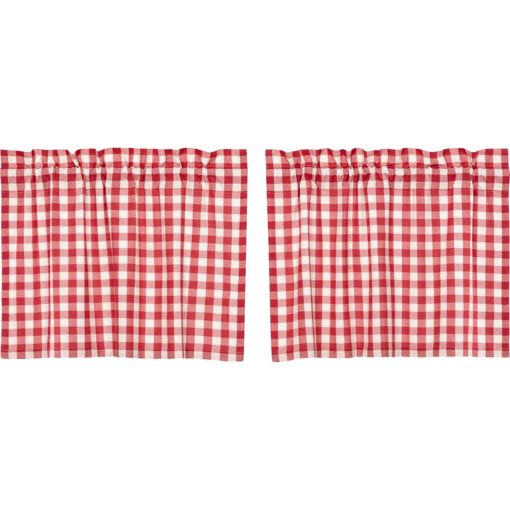 Create the perfectly charming country window of your dreams with these 24x36 inch tier-style curtains. Featuring red and white buffalo plaid, these short curtains provide just the right balance of privacy and sunshine. Pair with matching valances or prairie swag for a fully decorated look or alone for a simple pop of color and character. Also known as cafe or bistro curtains, these are a particularly good fit for decorating vintage kitchens, laundry rooms, and small bathroom windows.
