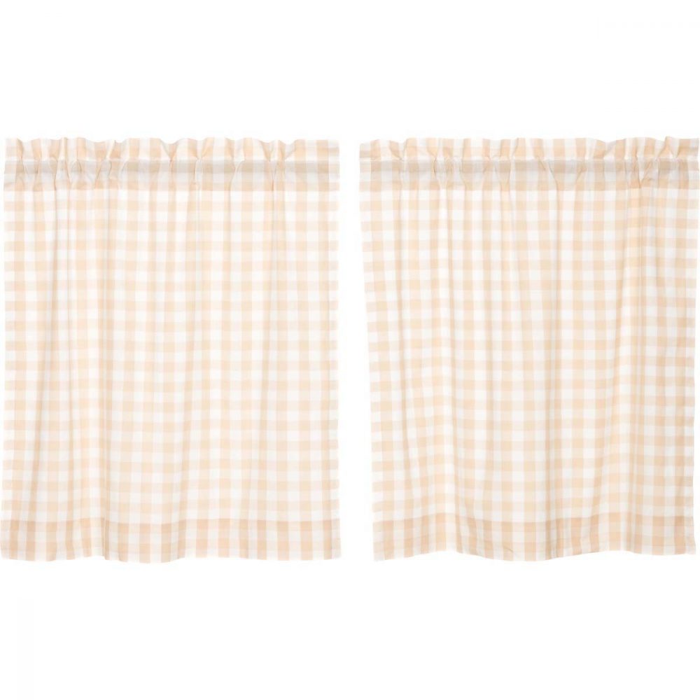 The Annie Buffalo Tan Check Tier Set is a fresh and lighthearted curtain set tailored to complete the look of your laid back farmhouse decor. Tan and antique white buffalo checks create a relaxed country feel in your home. Place these L36xW36 tier curtains in the kitchen or any window to enhance the style of a room. These 100% cotton curtains have a white lining to keep away the sun's glare and have a rod pocket for simple hanging.